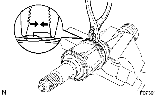 c. Using a snap ring expander, remove the front drive inner shaft inner RH shaft snap ring.