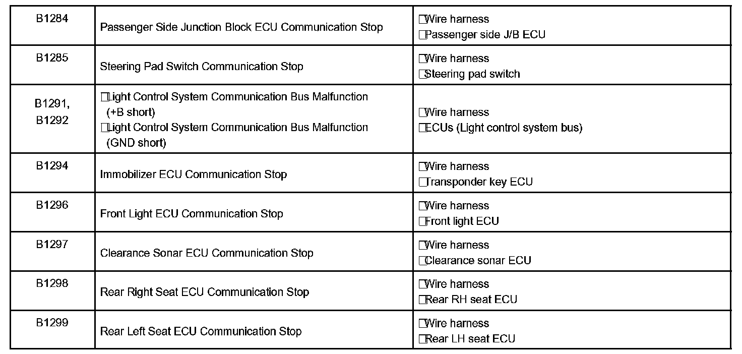 When "+B or GND short malfunction of communication bus" DTCs (B1214, B1215, etc.) and detected at the same time as "communication stop" DTCs (B1211, B1212, etc.), please repair the "+B or GND short malfunction of communication bus" DTCs first.