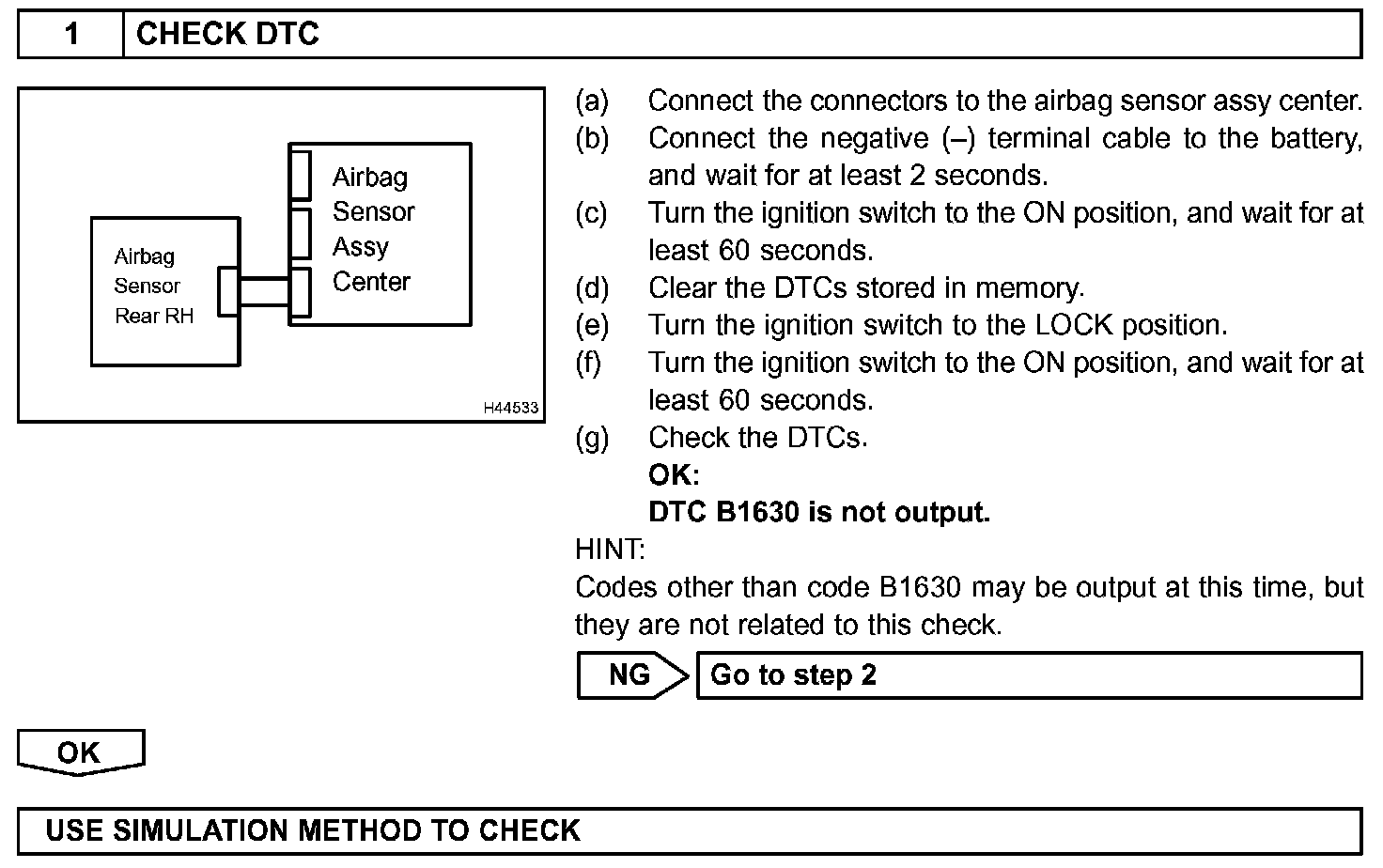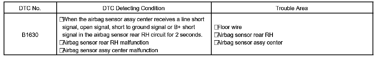 DTC B1630 is recorded when a malfunction is detected in the airbag sensor rear RH circuit.