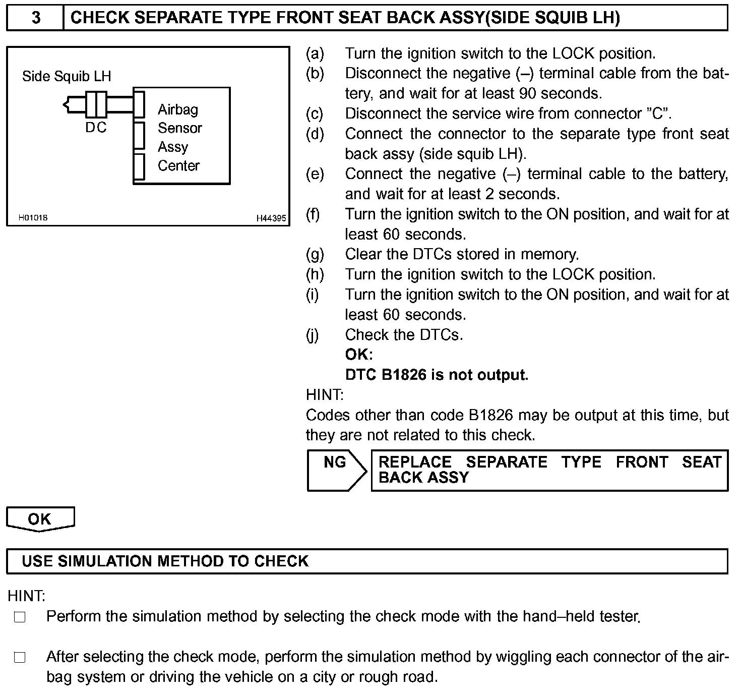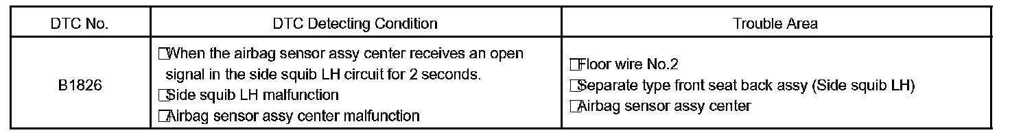 This circuit instructs the SRS to deploy when deployment conditions are met. DTC B1826 is recorded when an open circuit is detected in the side squib LH circuit.