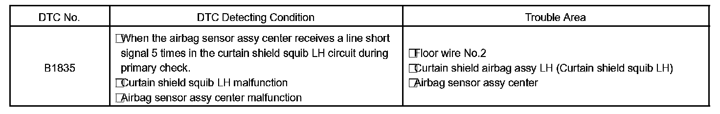 DTC B1835 is recorded when a short circuit is detected in the curtain shield squib LH circuit.