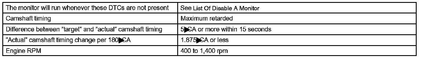 The ECM optimizes the valve timing using the VVT system to control the intake valve camshaft. The VVT system includes the ECM, the Oil Control Valve (OCV) and the VVT controller. The ECM sends a target duty-cycle control signal to the OCV. This control signal, applied to the OCV, regulates the oil pressure supplied to the VVT controller. The VVT controller can advance or retard the intake valve camshaft. The ECM calibrates the valve timing of the VVT system by setting the camshaft to the maximum retard angle when the engine speed is idling. The ECM closes the OCV to retard the cam. The ECM stores this value as VVT learned value. When the difference between the target valve timing and the actual valve timing is more than 5 ° Crankshaft Angle (CA) the ECM learns it.