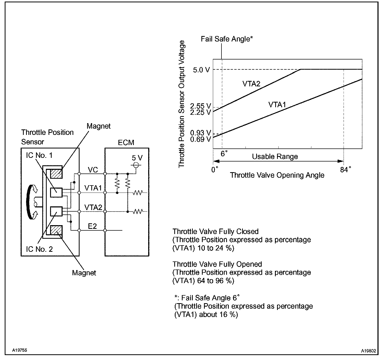 The throttle position sensor is mounted on the throttle body and it detects the opening angle of the throttle valve. This sensor is electronically controlled and uses Hall-effect elements so that accurate control and reliability can be obtained. The throttle position sensor has 2 sensor elements/signal outputs, VTA1 and VTA2. VTA1 is used to detect the throttle opening angle and VTA2 is used to detect malfunctions in VTA1. Voltage applied to VTA1 and VTA2 change between 0 V to 5 V in proportion to the opening angle of the throttle valve. There are several checks that the ECM performs to confirm proper operation of the throttle position sensor.