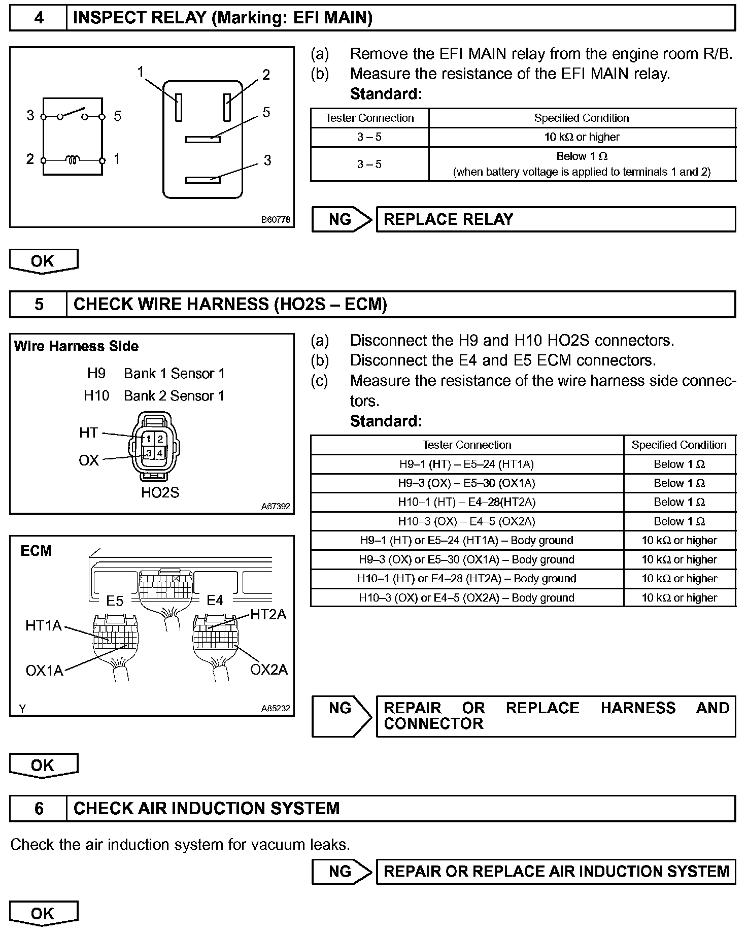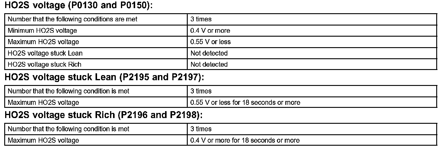 The HO2S should indicate RICH and LEAN alternately at a regular cycle under the air-fuel ratio feedback control. If the HO2S voltage remains at RICH or LEAN for about 20 seconds (x 3 times), the ECM interprets this as malfunction of the HO2S. The ECM illuminates MIL (2 trip detection logic) and sets a DTC.