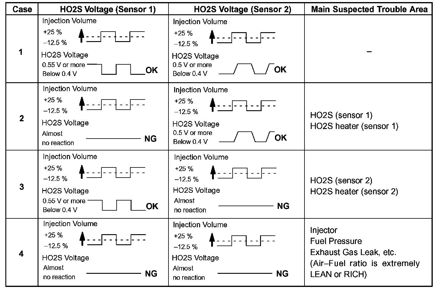 The injection volume can be switched to -12.5 % (decrease) or +25 % (increase) by the ACTIVE TEST. The ACTIVE TEST procedure enables a technician to check and graph the voltage outputs of the HO2Ss.