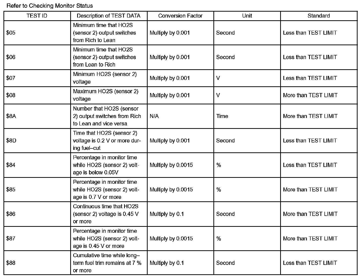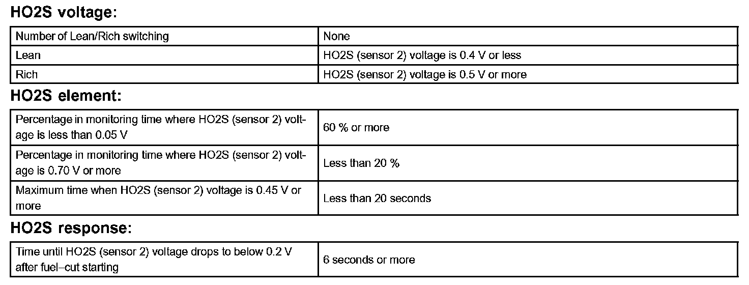 - The sensor's voltage drops to below 0.2 V (extremely Lean status) immediately when the vehicle decelerates and fuel-cut is operating. If the voltage does not drops to below 0.2 V, the ECM determine that the sensor's response feature has deteriorated, illuminates the MIL and sets a DTC.