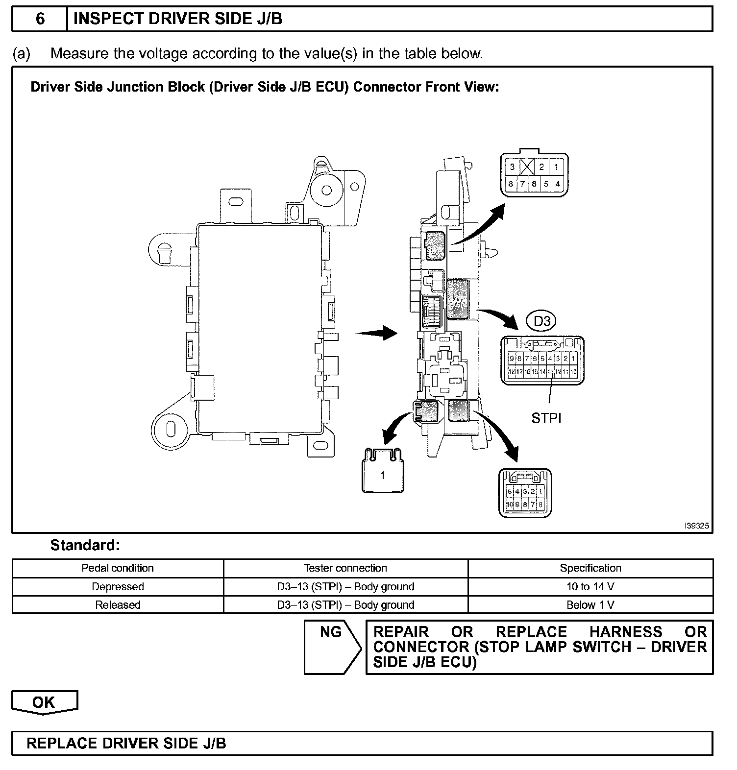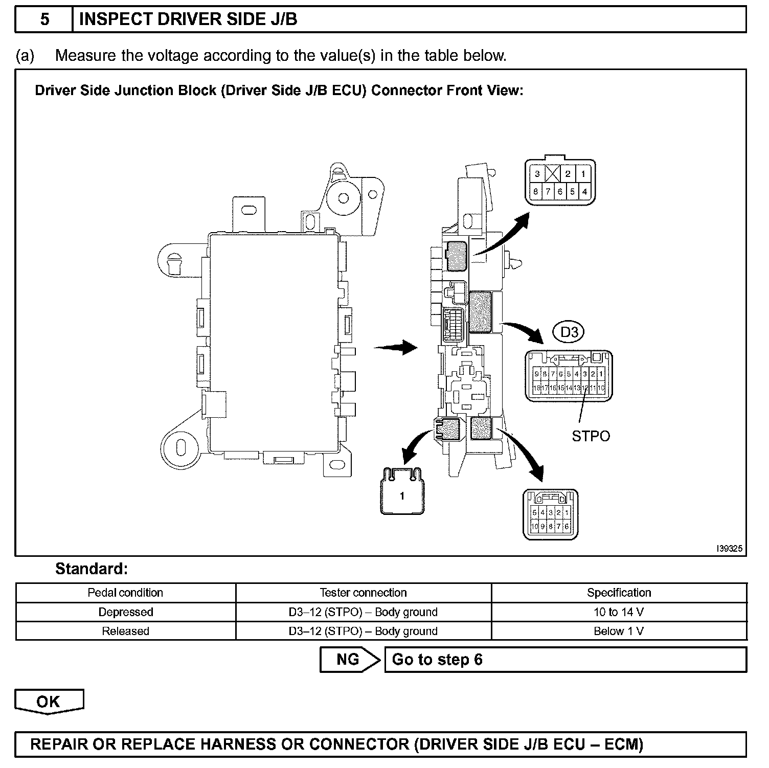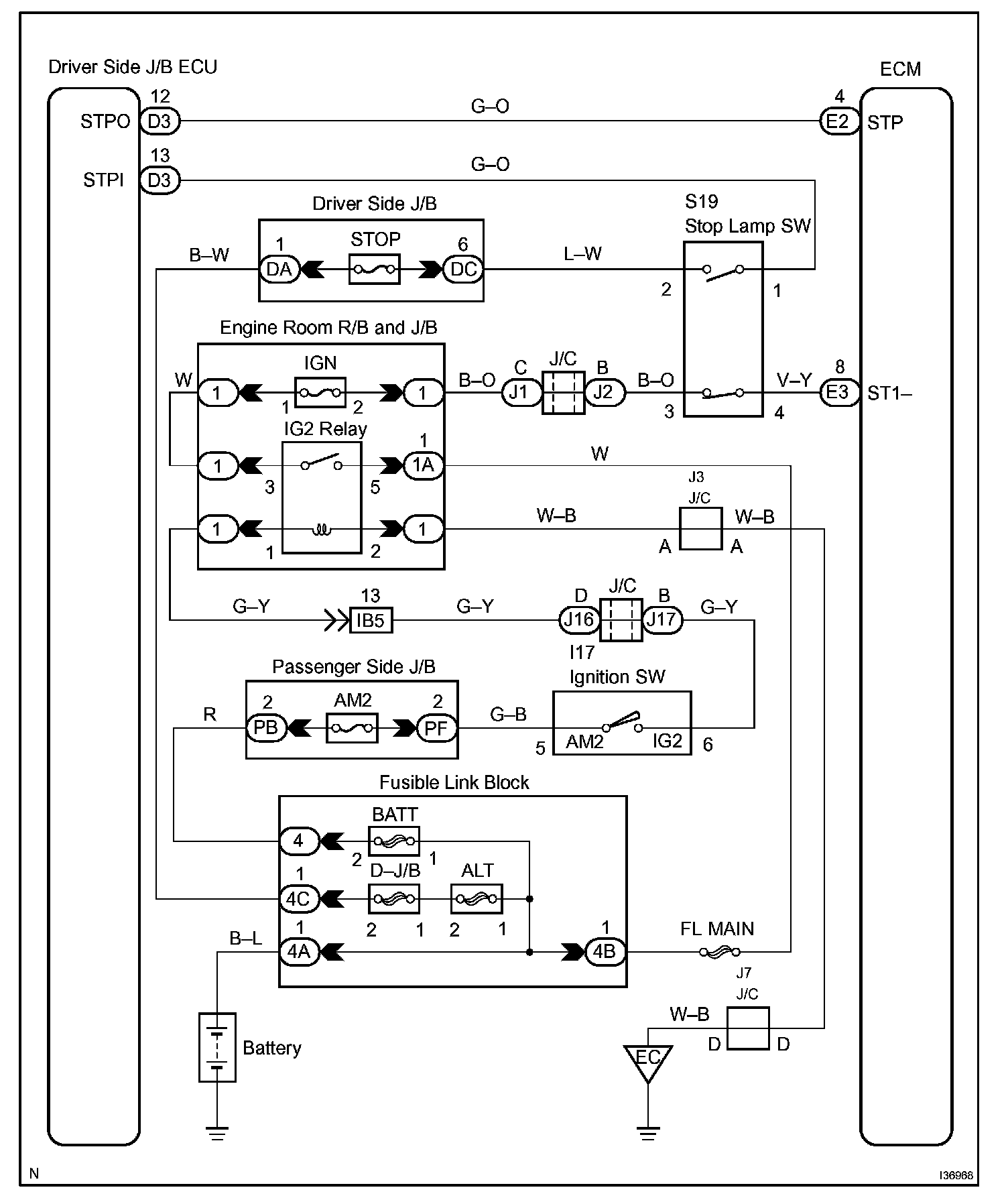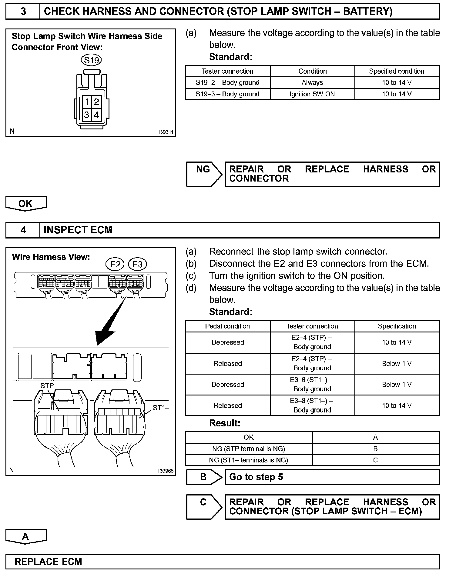 When the brake is applied, battery positive voltage is normally applied to terminal STP of the ECM through the STOP fuse and the stop lamp switch assembly, and the ECM turns the cruise control off.