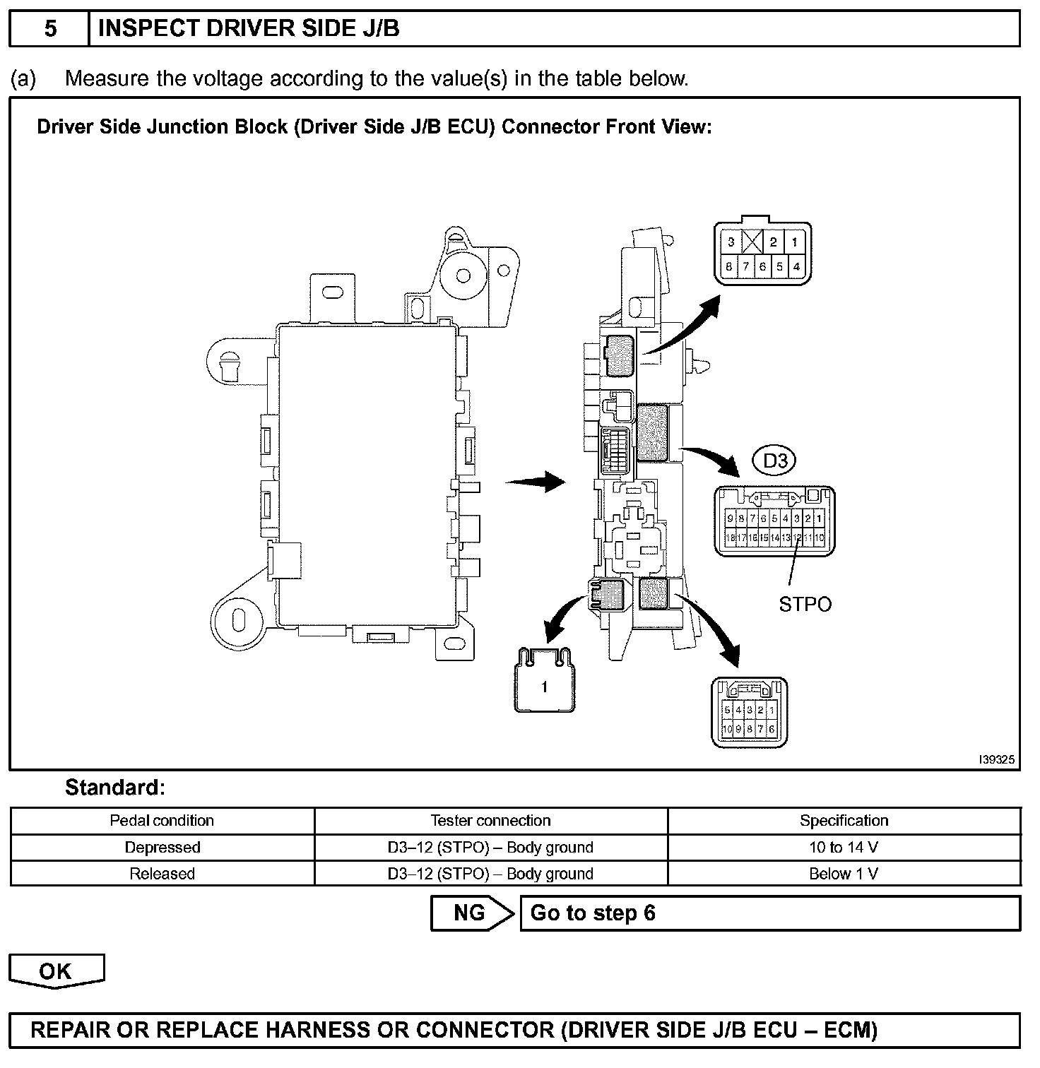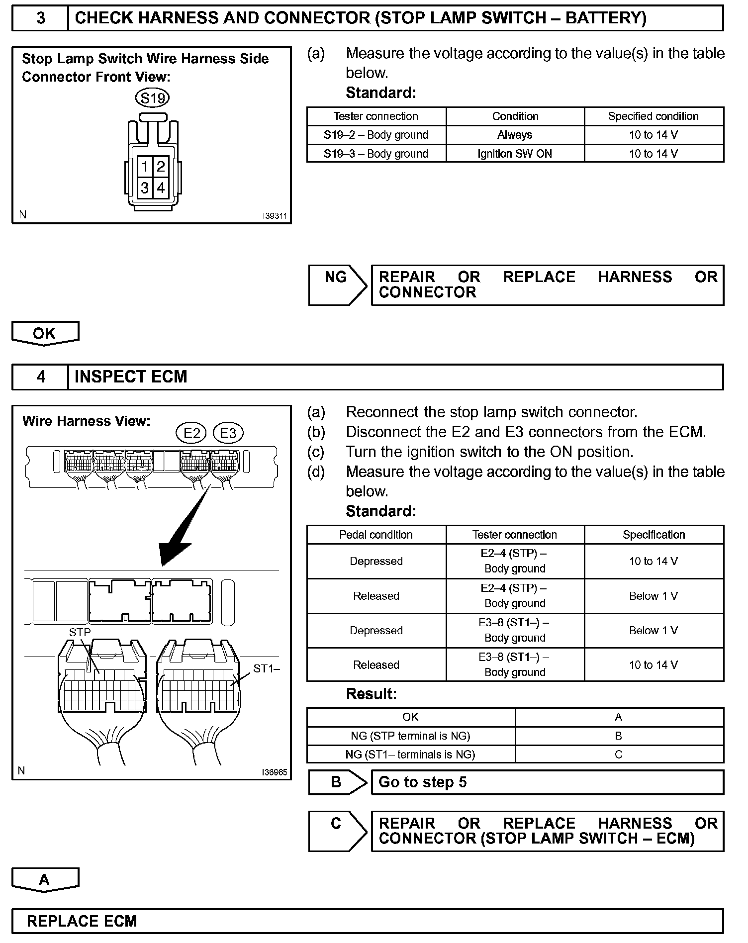 When the brake is applied, battery positive voltage is normally applied to terminal STP of the ECM through the STOP fuse and the stop lamp switch assembly, and the ECM turns the cruise control off.