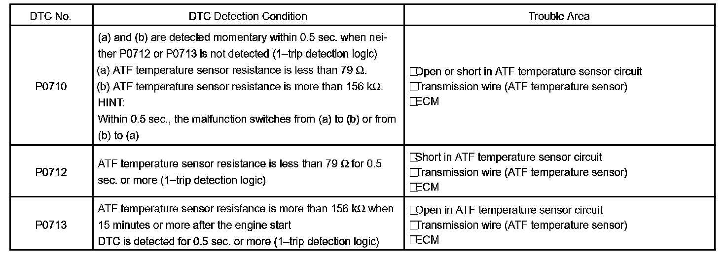HINT: If a circuit related to the ATF temperature sensor becomes open, P0713 is immediately set (in 0.5 second). When P0713 is set, P0711 cannot be detected.