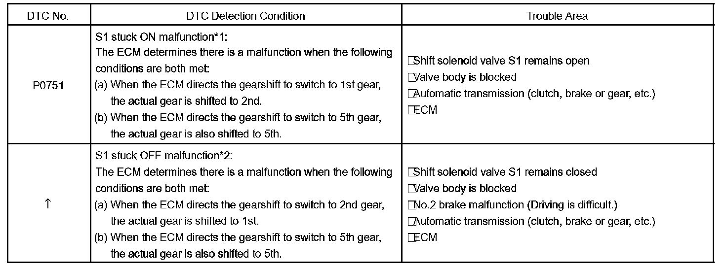 This DTC indicates "stuck ON malfunction" or "stuck OFF malfunction" of the shift solenoid valve S1. The ECM commands gear shifts by turning the shift solenoid valves "ON/OFF". When the gear position commanded by the ECM and the actual gear position are not same, the ECM illuminates the MIL and stores the DTC.