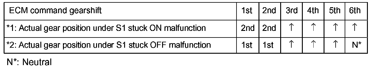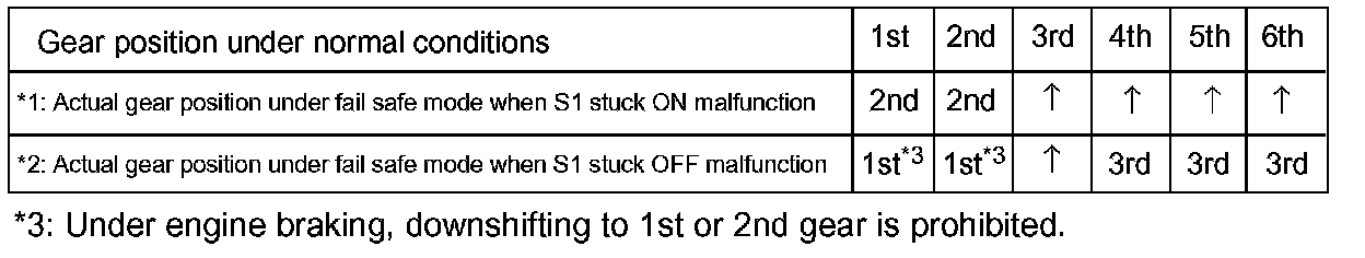 If any malfunction is detected, the ECM changes into the fail-safe mode to shift into the gear positions as shown in the table.