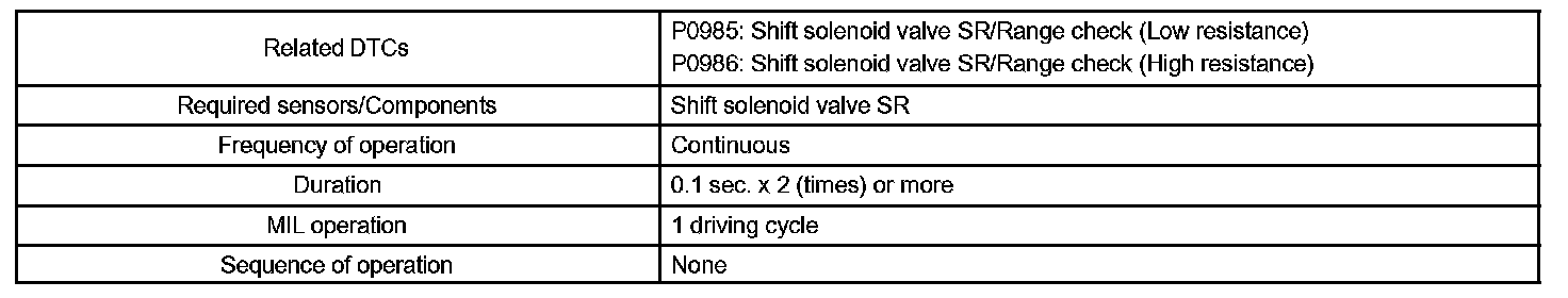These DTCs indicate an open or short in the shift solenoid valve SR circuit. When there is an open or short circuit in any shift solenoid valve circuit, the ECM detects the problem and illuminates the MIL and stores the DTC. When the shift solenoid valve SR is on, if resistance is 8 W or less, the ECM determines there is a short in the shift solenoid valve SR circuit.