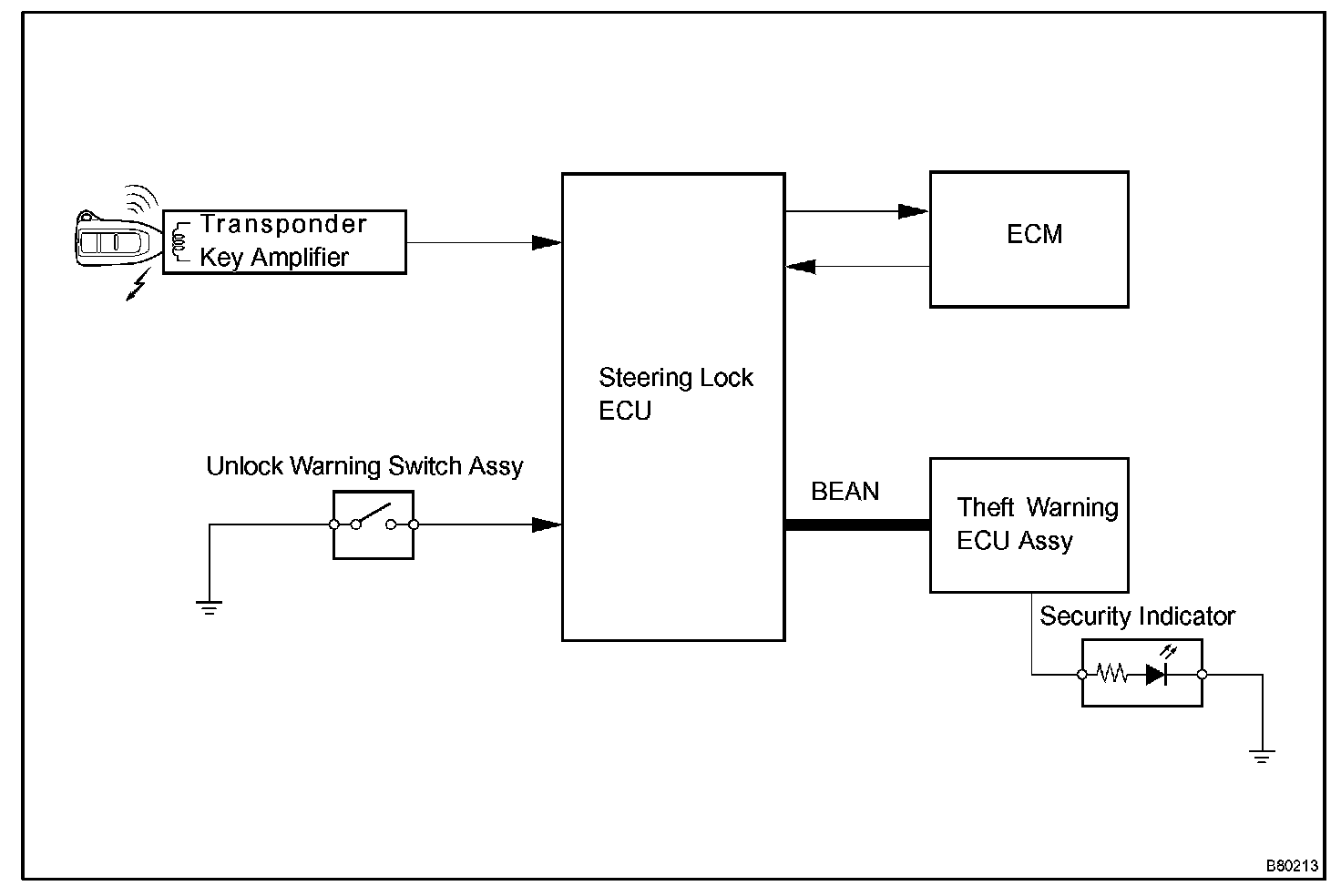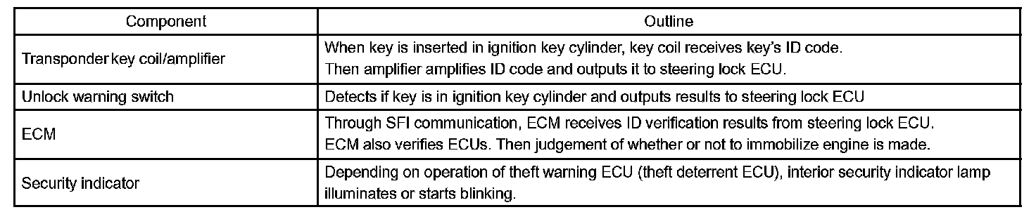 When the steering lock ECU detects that the unlock warning switch is ON, the ECU provides current to the transponder key coil and produces a faint electric wave. A transponder chip in the key and receives the faint electric wave. Upon receiving the faint electric wave, the transponder chip outputs a key ID code signal. The transponder key coil receives this signal, the transponder key amplifier amplifies it, and then the signal is transmitted to the ECU.