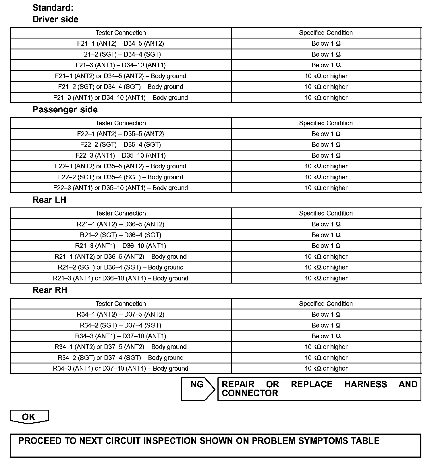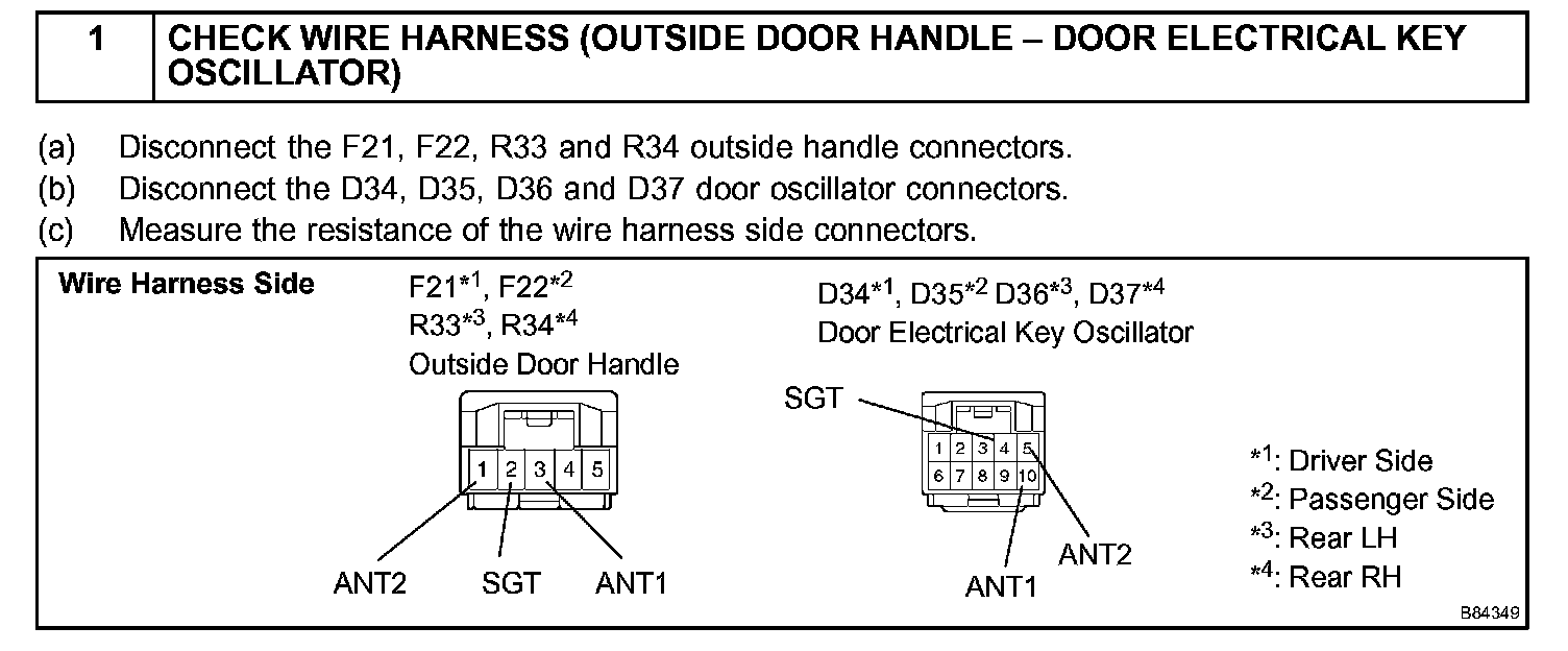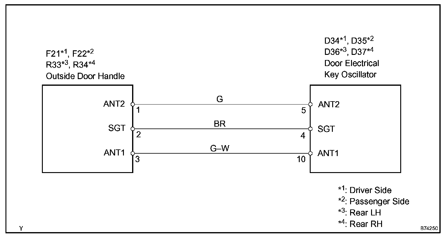Terminals ANT1 and ANT2 of the door outside handle detect if the smart key is within the detection area around the door outside handle.