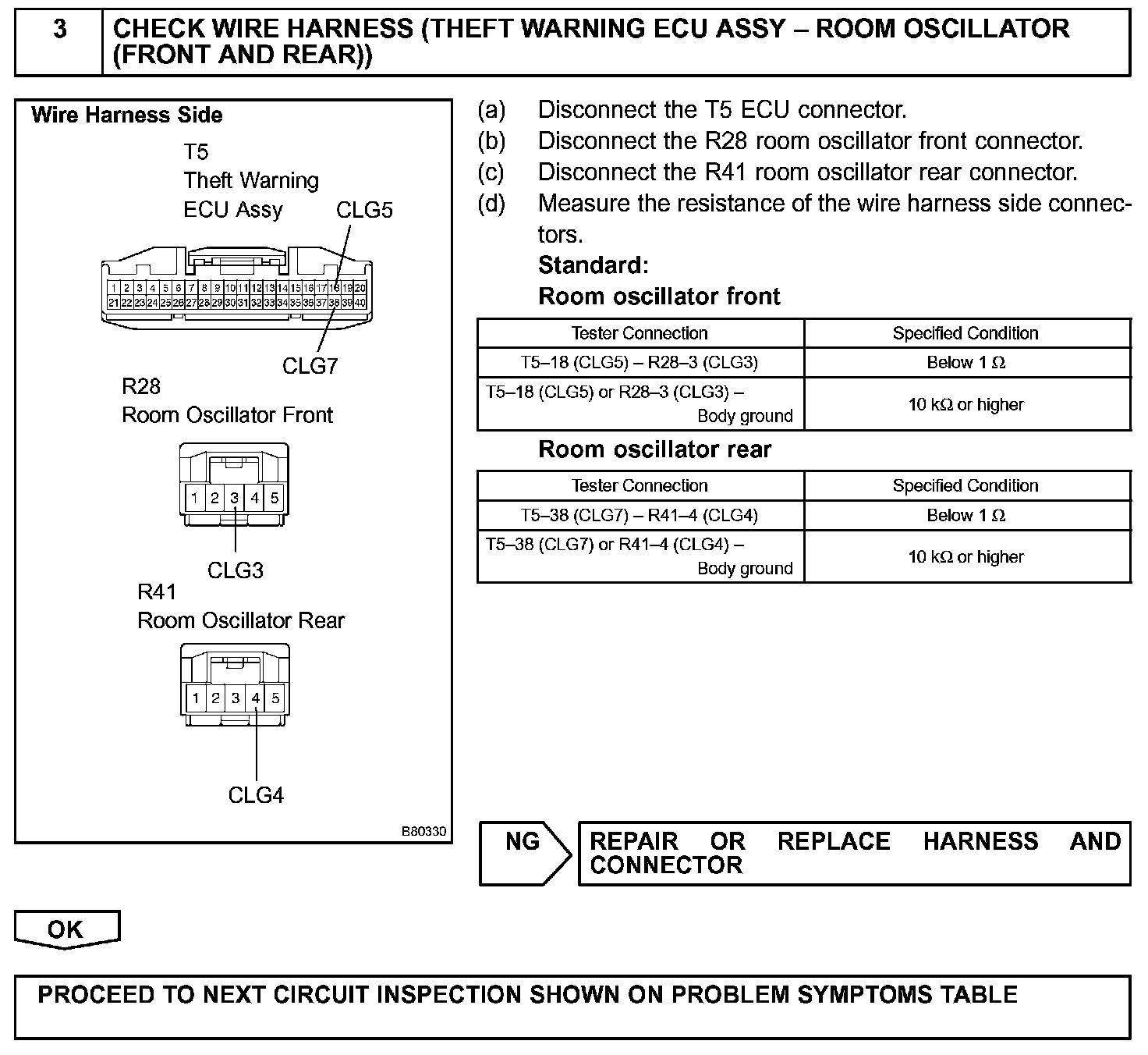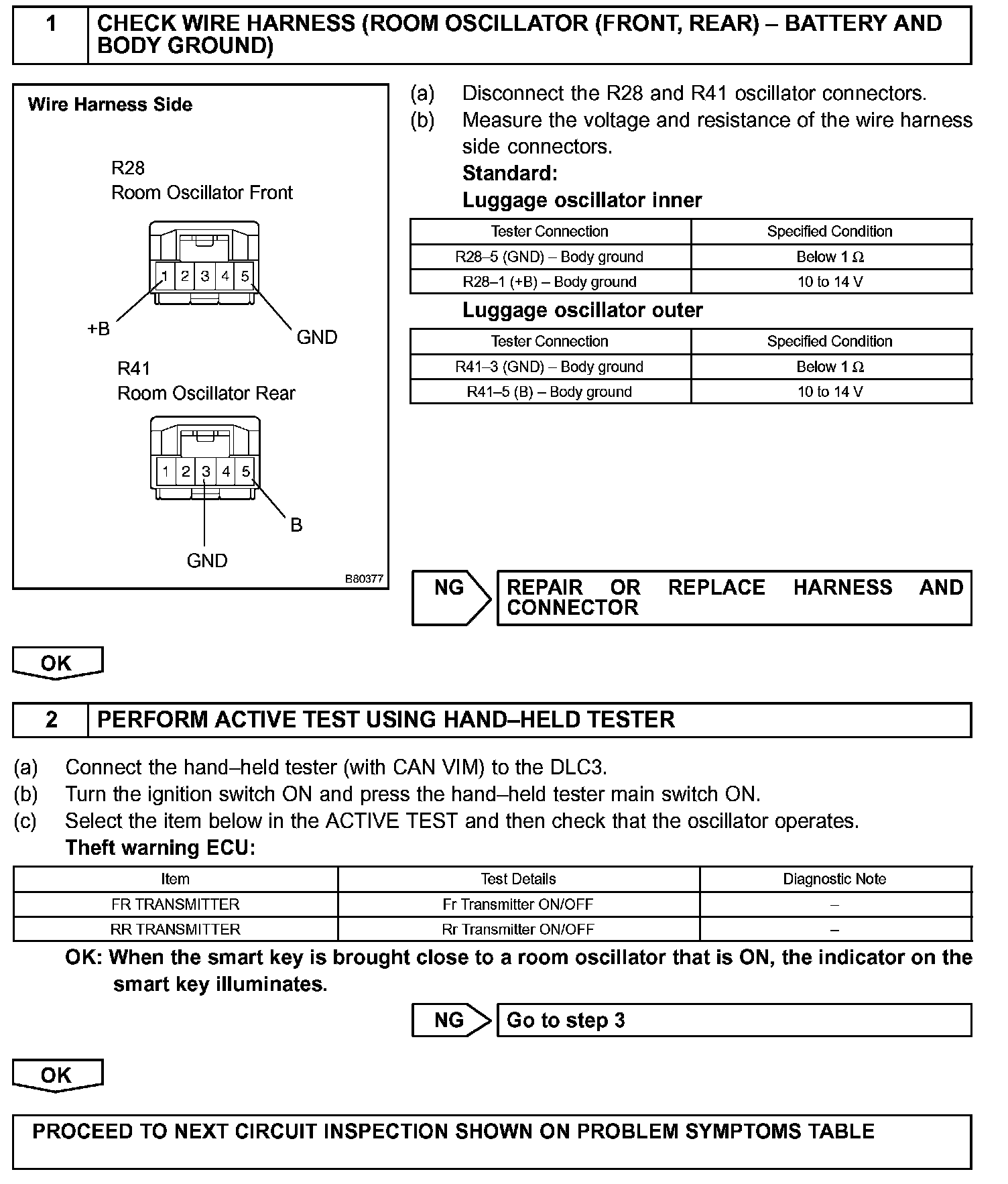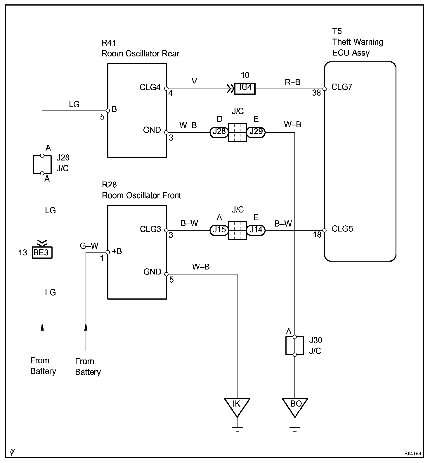 The theft warning ECU activates the front and rear room oscillators. The power is supplied from the driver side J/B to both the room oscillators. The front and rear room oscillator circuits have the same wiring. If the smart key system does not operate properly inside the vehicle, check the circuit for these oscillators.