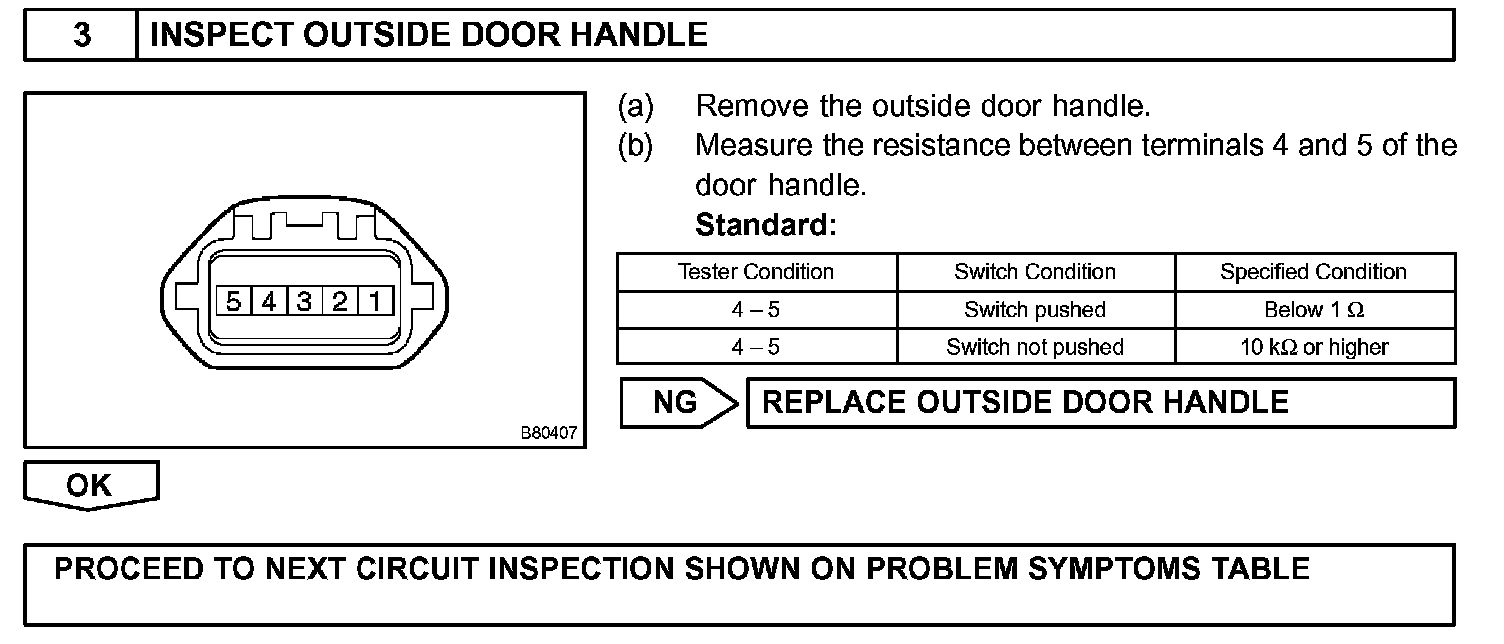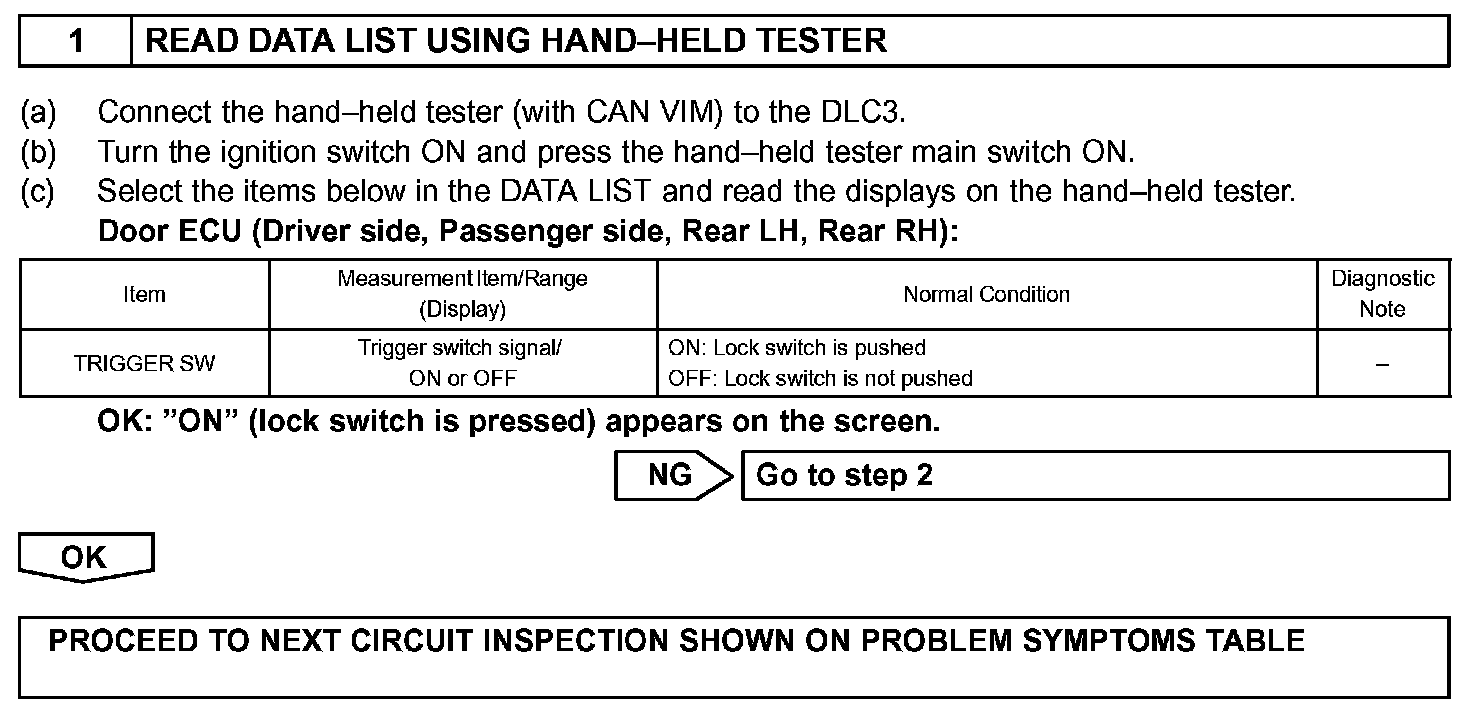 Trigger switches are built into the outside handles of each door. Door ECUs detect the conditions of the each lock switch (trigger switch).
