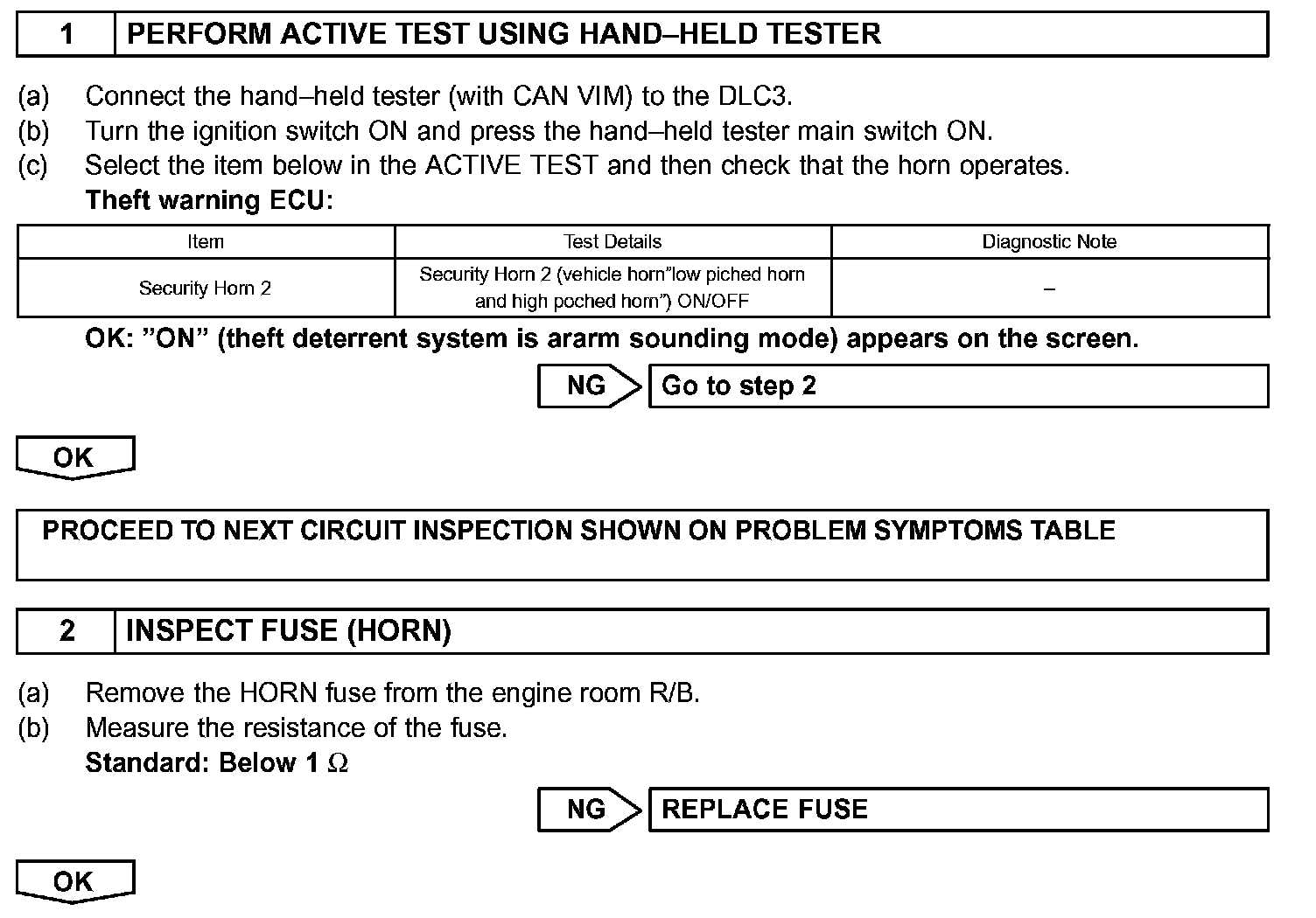 When the theft deterrent system is switched from the armed state to the alarm sounding state, the theft warning ECU (theft deterrent ECU) transmits a signal to cause the horn to sound at intervals of 0.4 seconds.