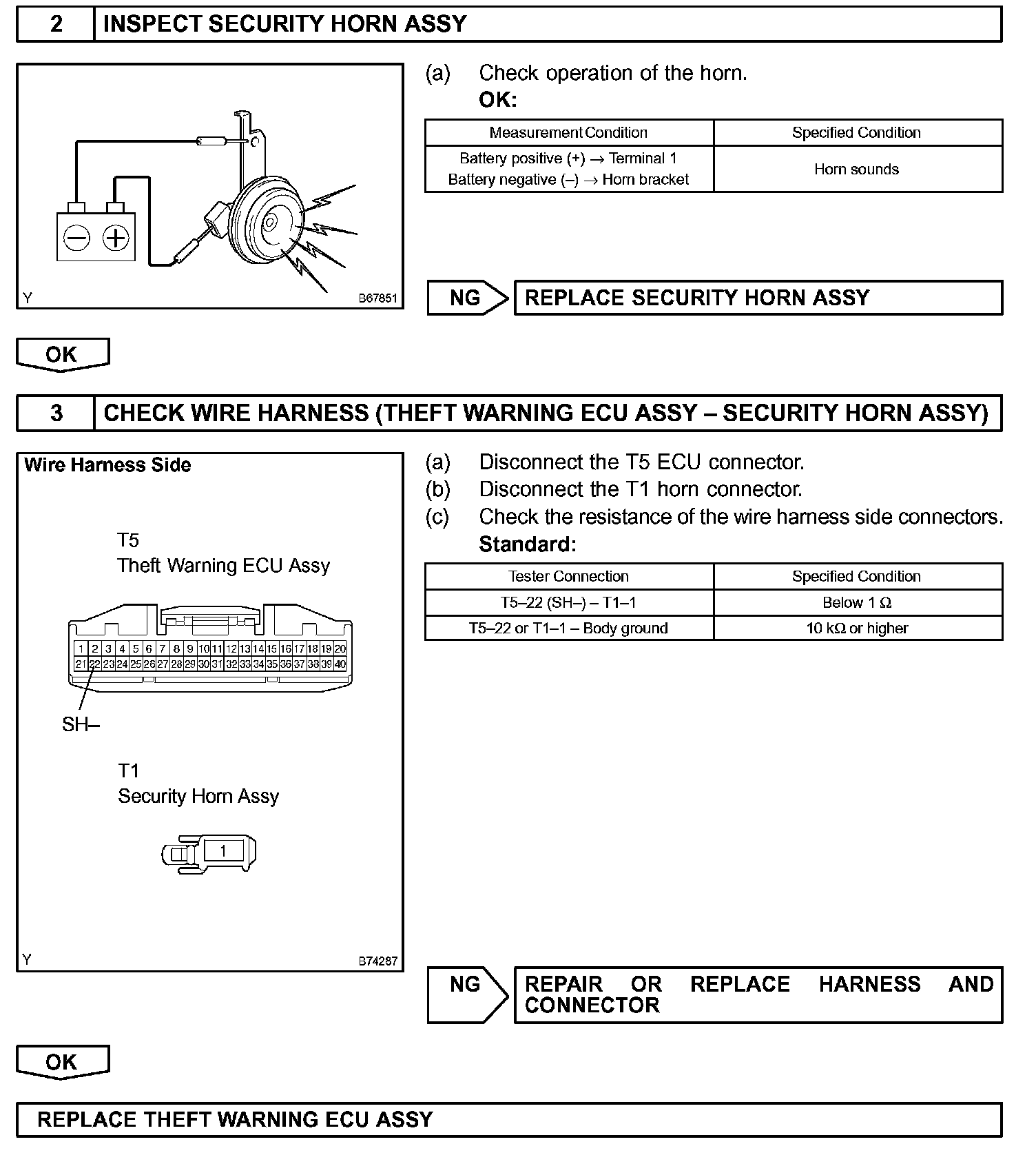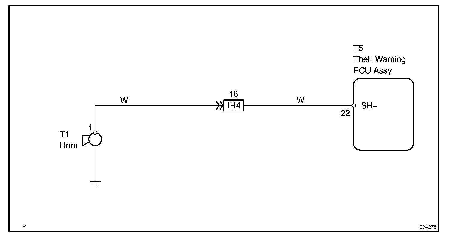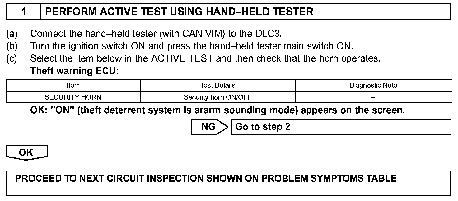 When the theft deterrent system is operating, a relay in the theft warning ECU (theft deterrent ECU) turns ON and OFF continuously at 0.2 seconds intervals, causing the security horn to sound.