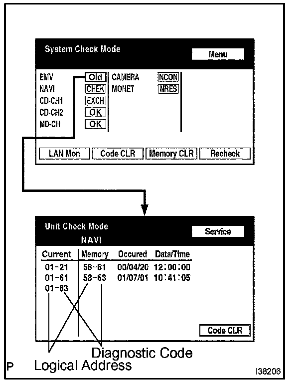 - If "EXCH", "CHEK" and "Old" as well as "OK" exist, press the service switch to return to the "System Check Mode". Then, check the "Unit Check Mode" screen and record them on the customer problem analysis check sheet.