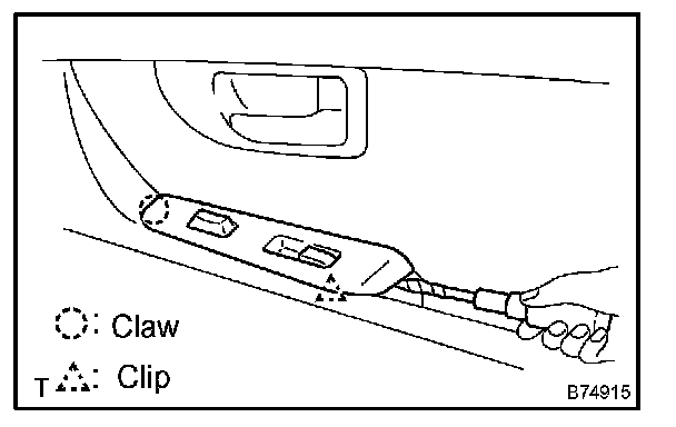 c. Using a screwdriver, disengage the 2 claws and remove the power window switch from the armrest assembly.
