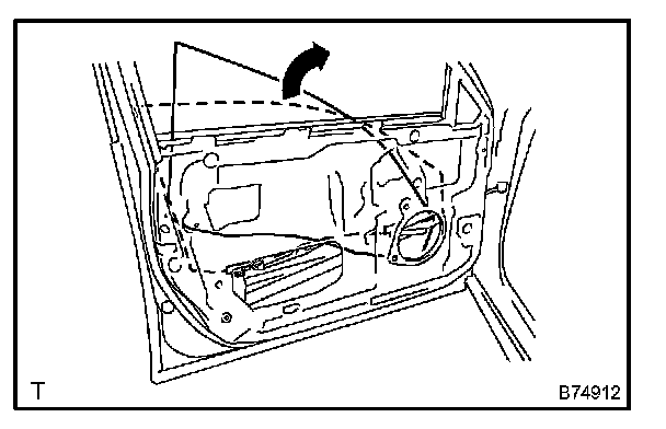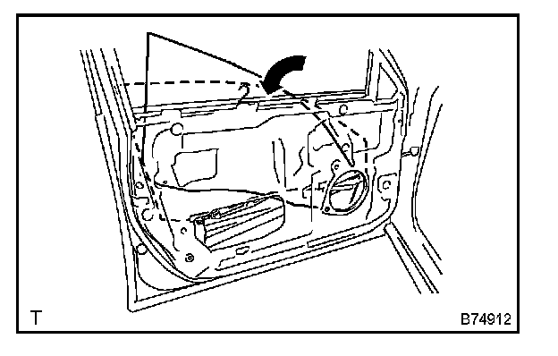 a. Insert the door glass into the door panel along the glass run in the direction indicated by the arrow mark in the illustration.