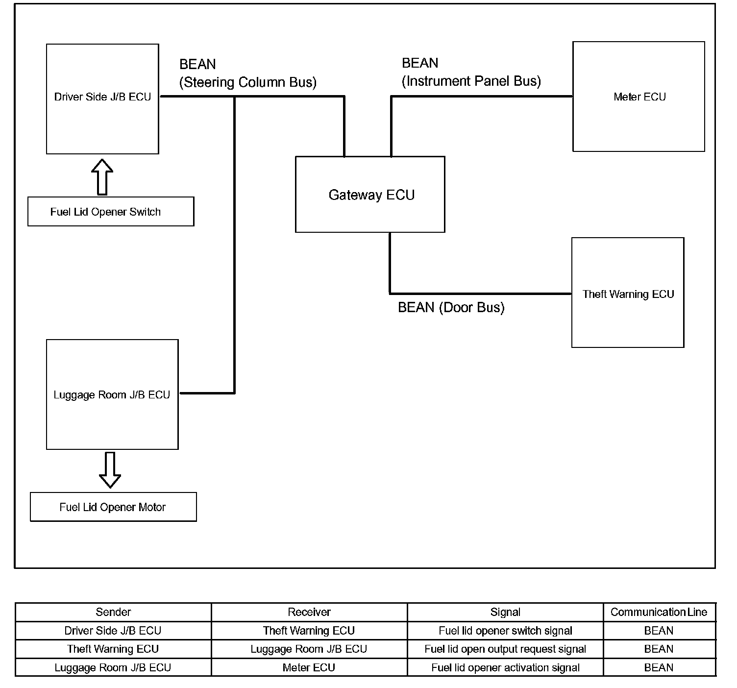 When a fuel lid opener switch ON signal is input to the driver side J/B ECU, the driver side J/B ECU outputs this signal to the theft warning ECU through the gateway ECU using the BEAN. The theft warning ECU, which receives different kinds of data using the BEAN, judges if the fuel lid can be opened or not. When the judgment is made that the fuel lid can be opened, a fuel lid open output request signal is sent to the luggage room J/B ECU through the gateway ECU. While the theft warning system is operating, the fuel lid cannot be opened by switch operation in order to prevent theft.