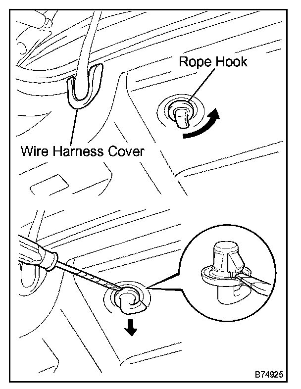 HINT: Turn the rope hook 90 degrees counter clockwise. Insert a screwdriver (with its tip taped) into the slit in the side of the rope hook. Hold down the claw inside the slit and remove the rope hook as shown in the illustration.