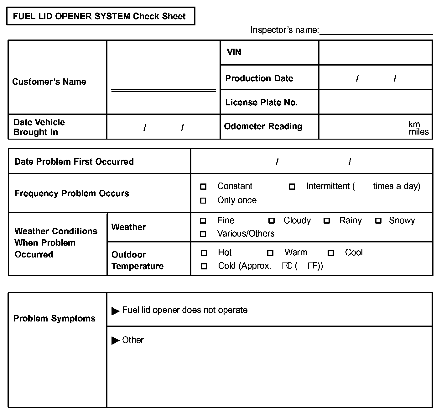 Fuel Lid Opener System Check Sheet:
