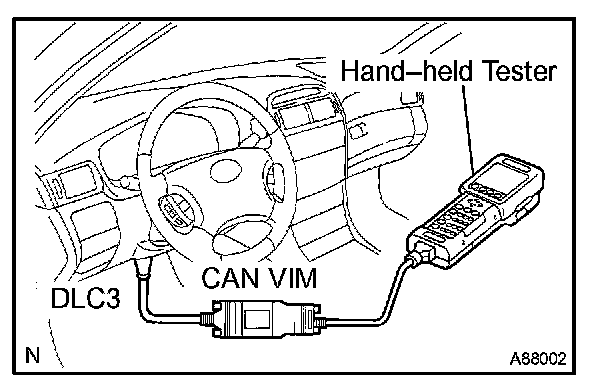CHECK DTCa. Connect the hand-held tester to the Controller Area Network Vehicle Interface Module (CAN VIM). Then connect the CAN VIM to the DLC3.