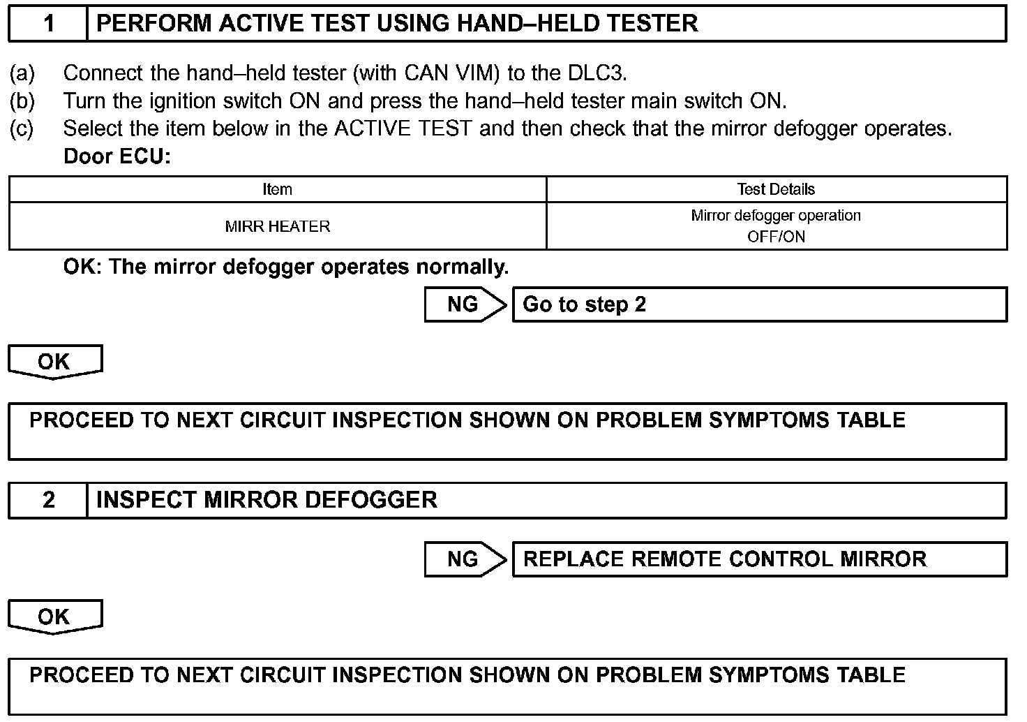 The door ECU operates the mirror defogger when it receives signals from the defogger switch, wiper switch and rain sensor.