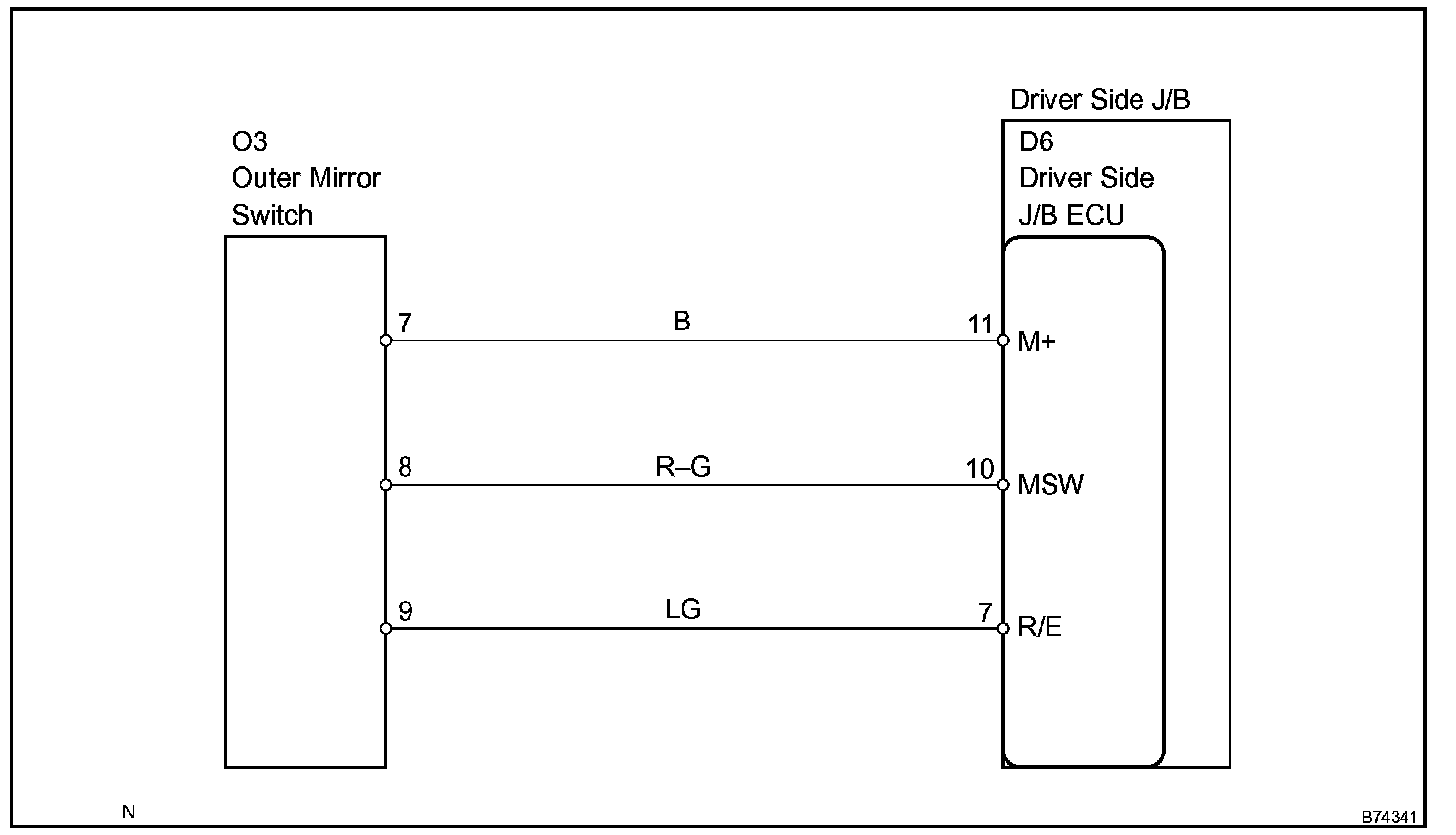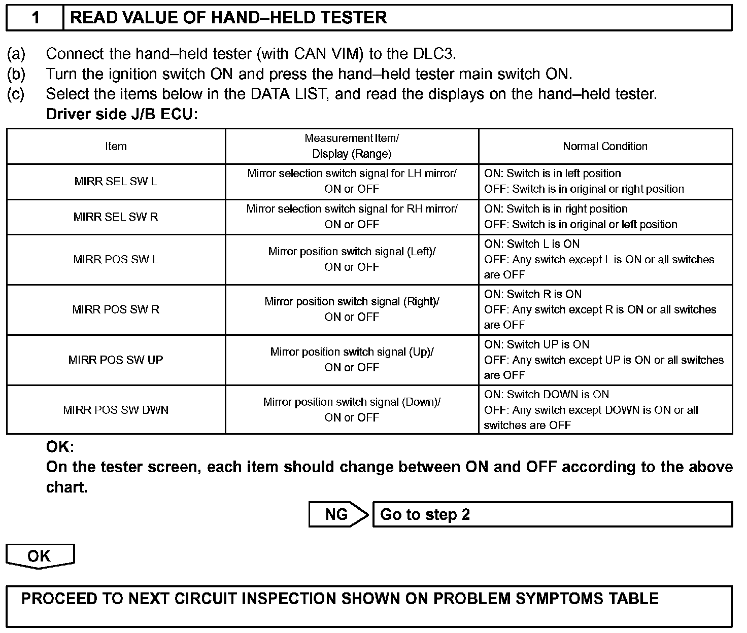 The operating condition of the mirror switch is input by the driver side J/B ECU and the input signals are sent to the driver door ECU or the passenger ECU.