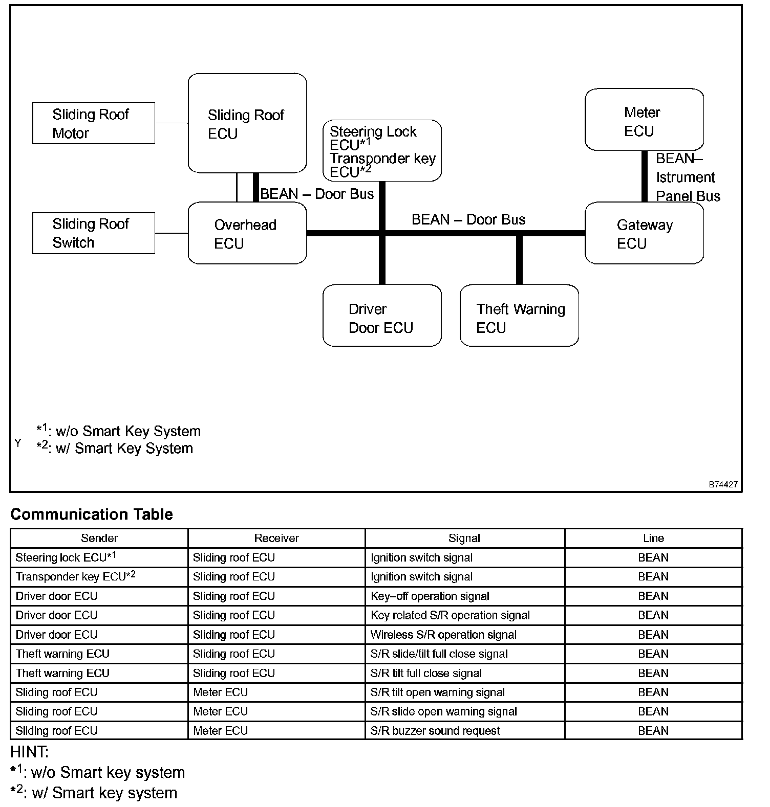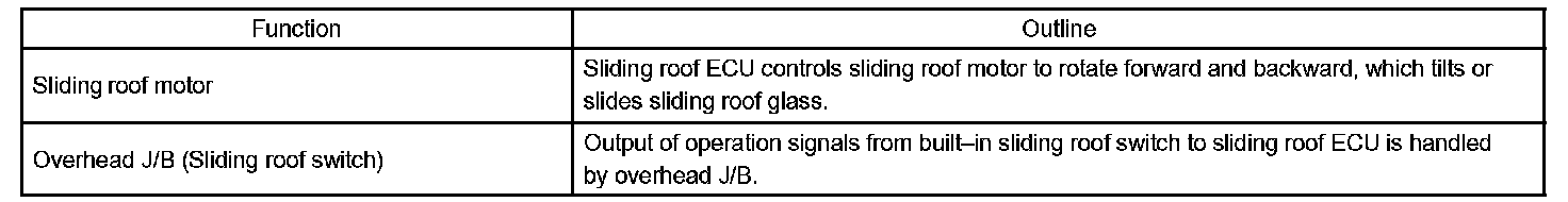 In this system, available functions are AUTO tilt-up and tilt-down; AUTO sliding open and close; jam protection; key-linked open and close; transmitter-linked open; and AUTO operation open and close (with ignition switch OFF).