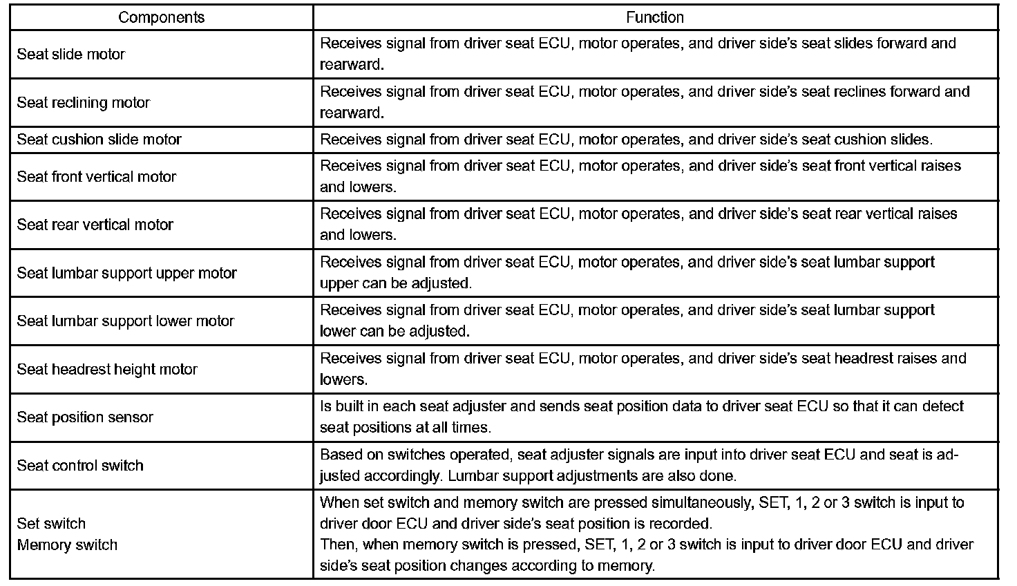 For the memory function, first, memory switch operation is transferred from the driver door ECU to the driver seat ECU via the multiplex communication line. Then, either the seat position is recorded in memory or a previously recorded seat position is recalled.