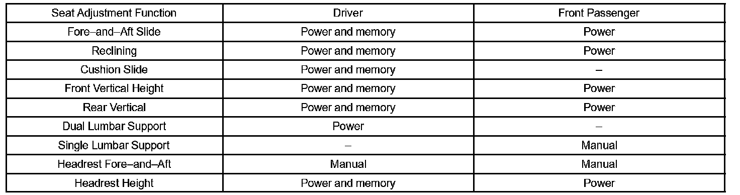 The front power seat's adjustment and position memory are shown in the chart.