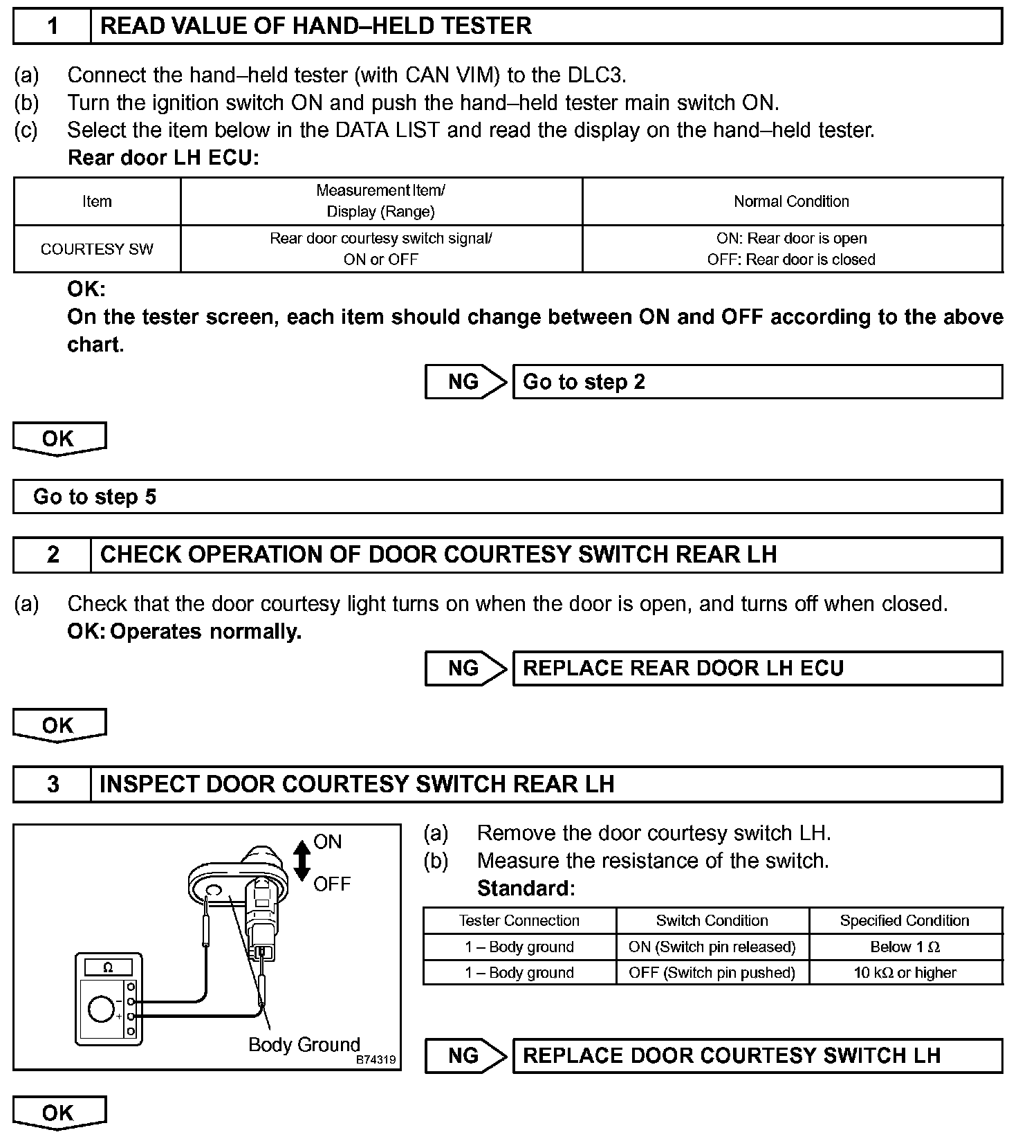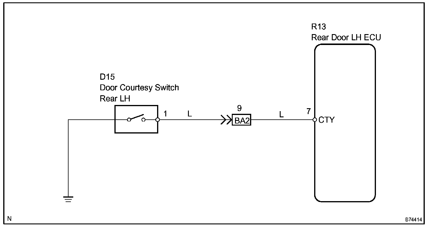 The rear door LH ECU detects the condition of the door courtesy switch and sends the information to each ECU via the multiplex communication circuit.