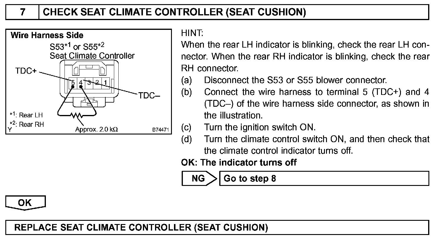 As a result of a short circuit, overcurrent may occur in the Peltier element of the seat climate controller, fan motor or rear seat heater. If this happens, output from the Peltier element, fan motor, rear seat heater and idle-up signal (not including the front passenger side) will be stopped and the indicator illuminates according to blinking pattern 1.