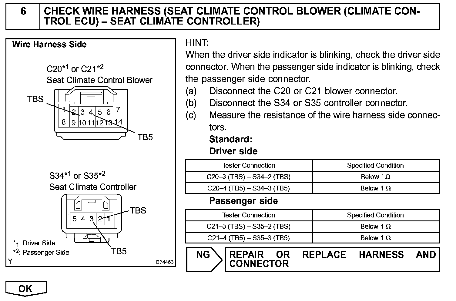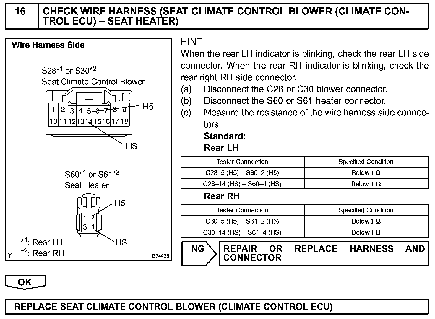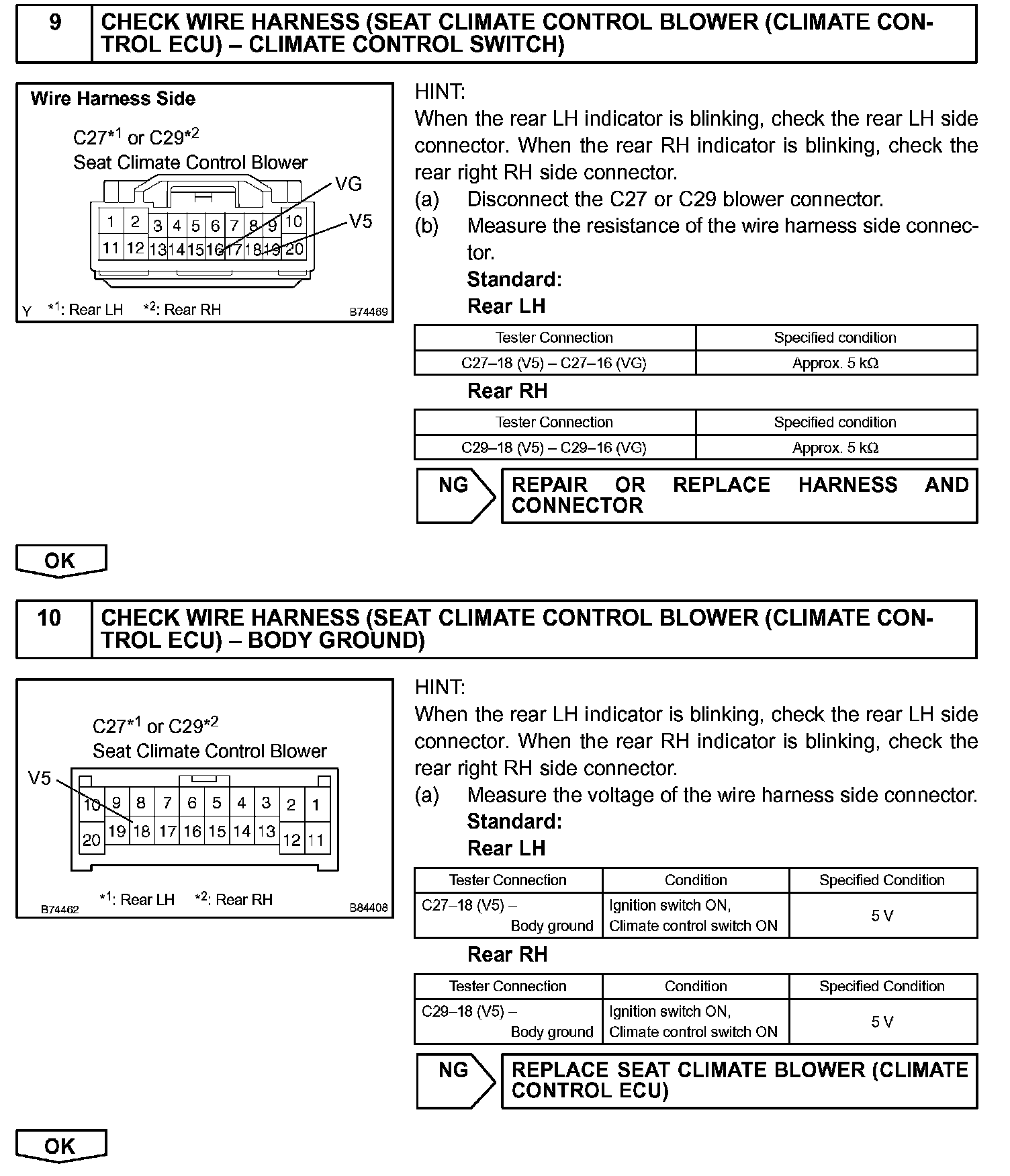 As a result of an short circuit, the ECU may not be able to provide 5 V of power voltage to the seat climate controller thermistor circuit, climate control switch's volume control circuit or rear seat heater thermistor circuit. If this happens, all output will be stopped and the indicator illuminates according to blinking pattern 3.