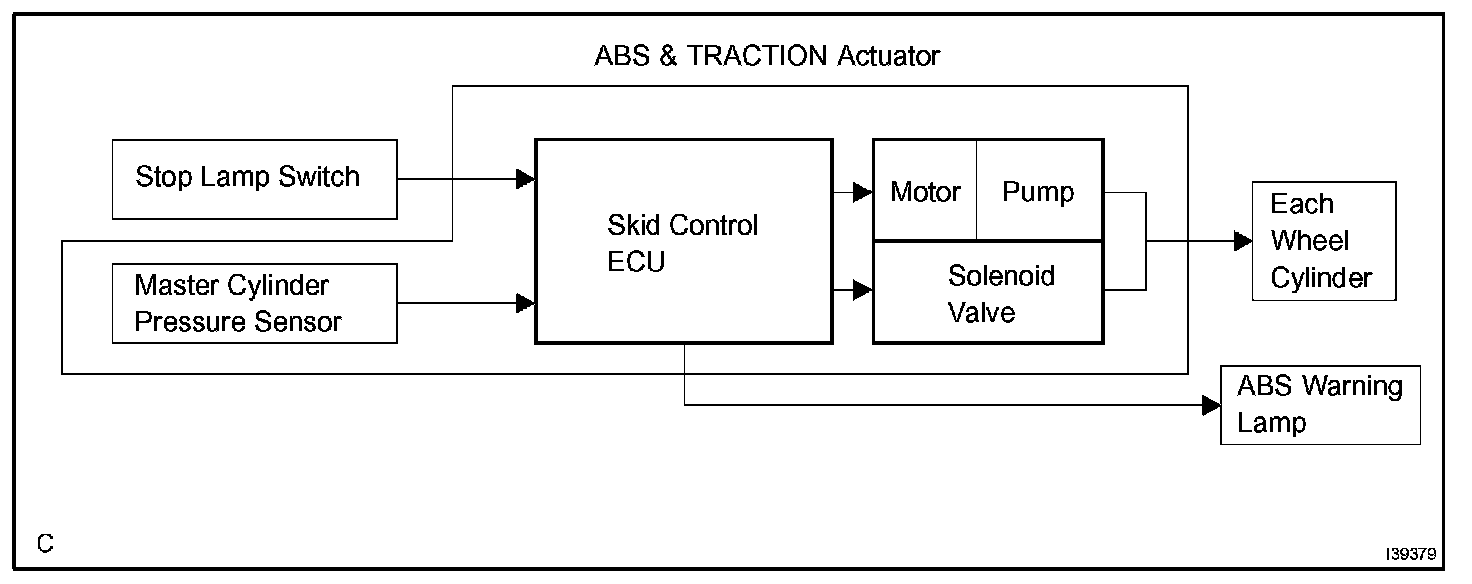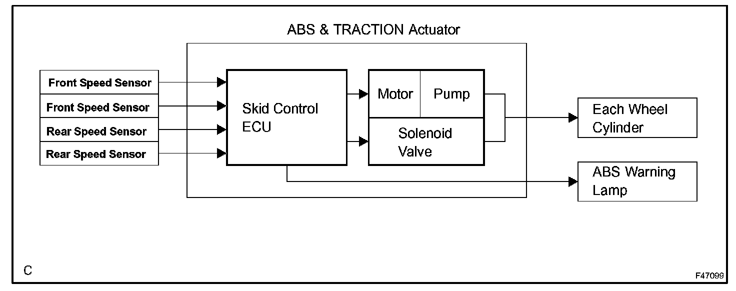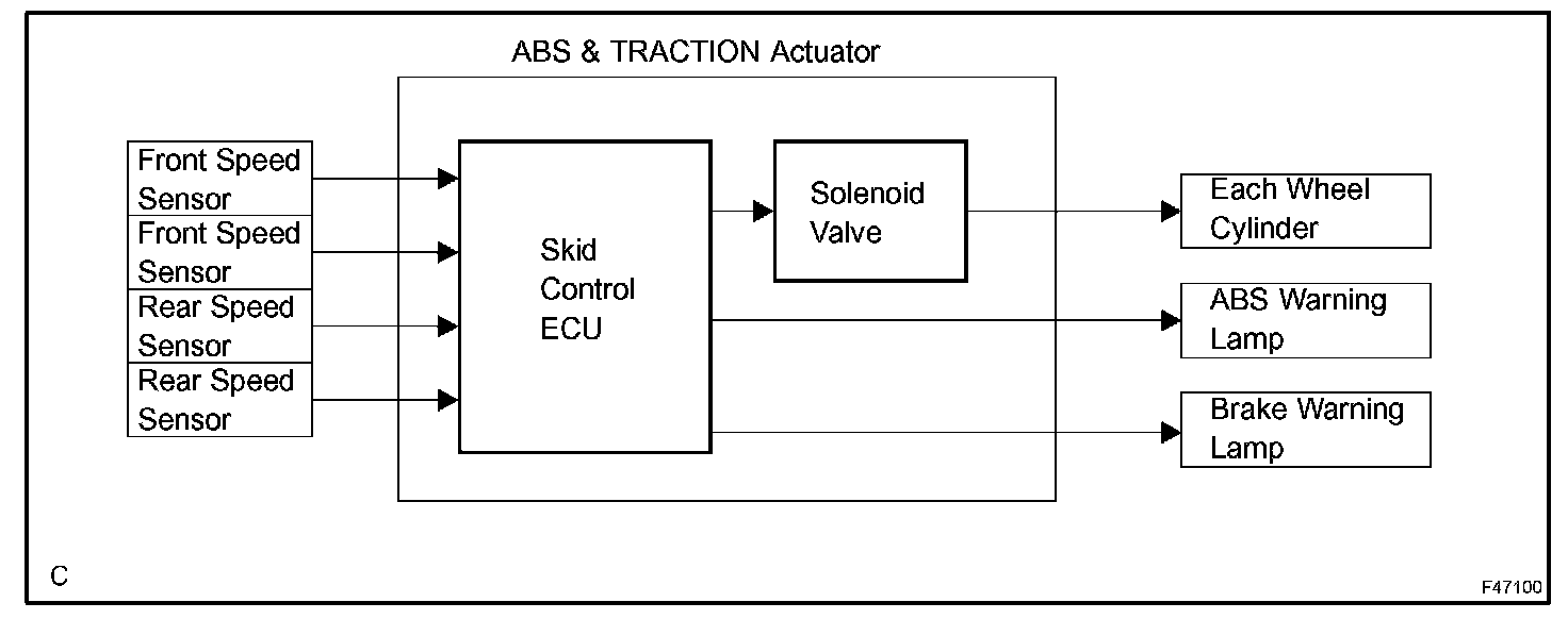 The skid control ECU detects wheel lock condition by receiving vehicle speed signals from each speed sensor, and sends control signals to the pump motor and solenoid valve. The pump motor and solenoid valve avoid wheel lock by controlling the oil pressure of each wheel cylinder.