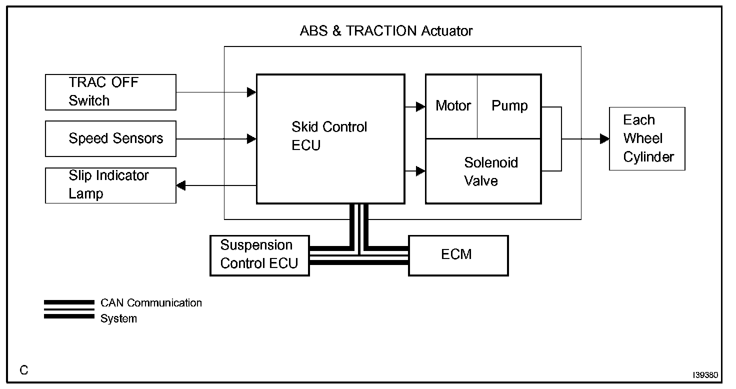 The skid control ECU receives the speed signal from each speed sensor to detect the slip condition of the wheels and sends the control signal to the solenoid.
