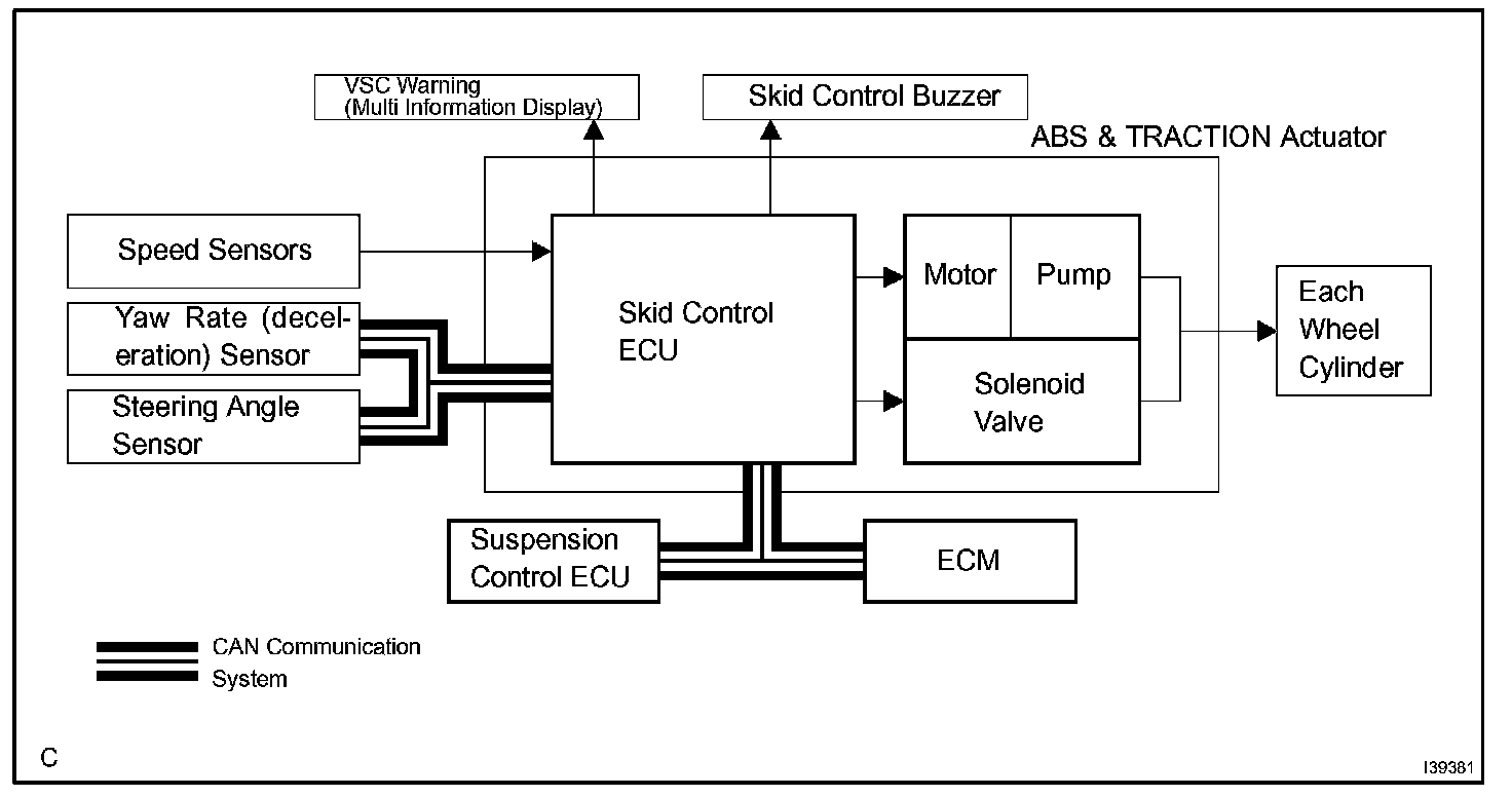 a. Skid control ECU calculates vehicle stability tendency based on the signal of sensors, speed sensor, yaw rate and deceleration sensor and steering angle sensor. And it judges whether the control of engine output torque by electronic control throttle and of wheel brake pressure by brake actuator will operate or not by the calculation results.