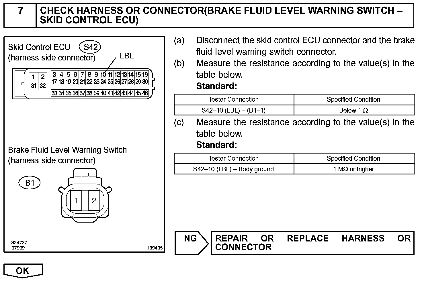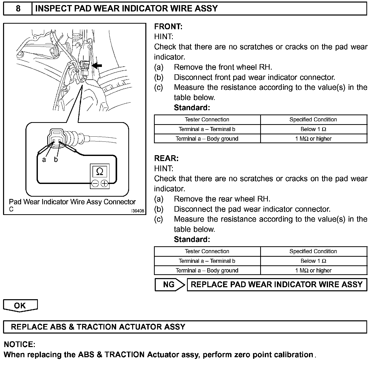 If the wear indicator wire is open, "Brake Wear" appears on the multi-information display, which indicates that the pad must be replaced.