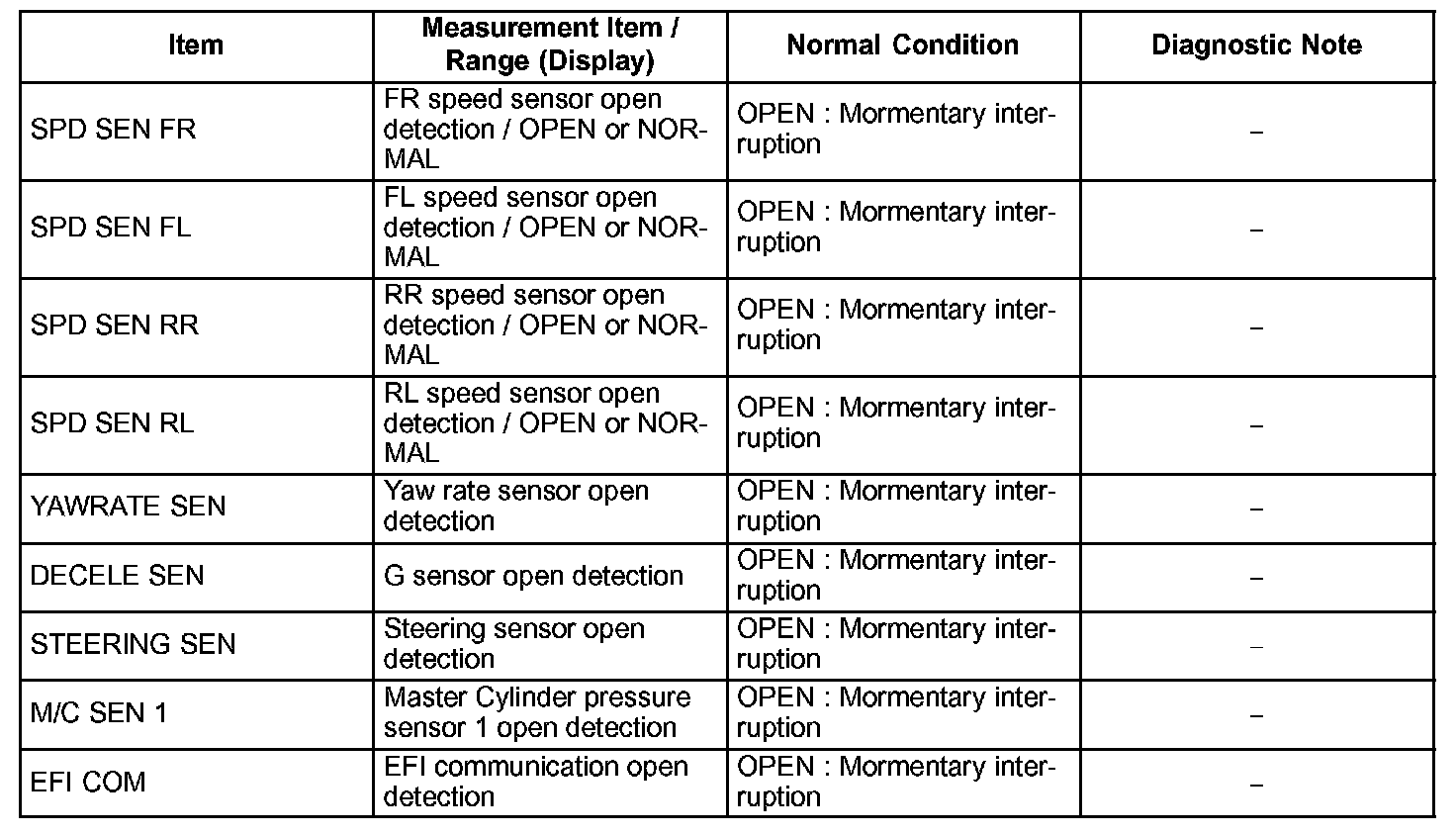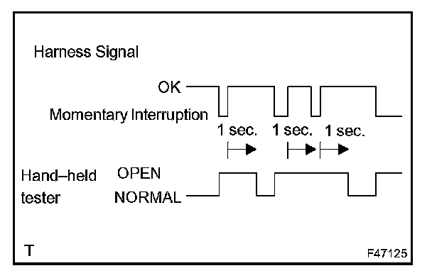 - The OPEN display on the hand-held tester remains on for 1 second after the harness signal changes from momentary interruption (open circuit) to normal condition.