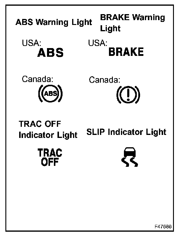 b. When the ignition switch is turned to the ON position, check that the ABS warning light, TRAC OFF indicator light, BRAKE warning light and SLIP indicator light come on for approximately 3 seconds.