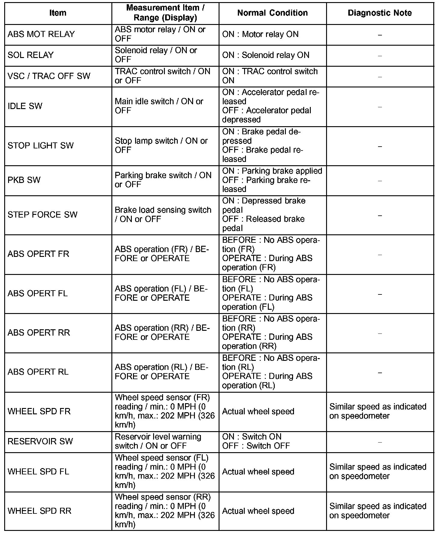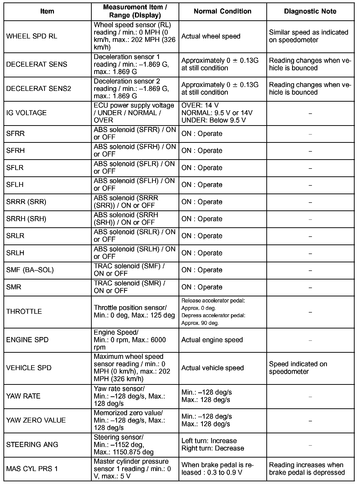HINT: With the hand-held tester connected to the DLC3 and the ignition switch in the ON position, the ABS, TRAC and VSC data list can be displayed. Follow the prompts on the tester screen to access the DATA LIST.