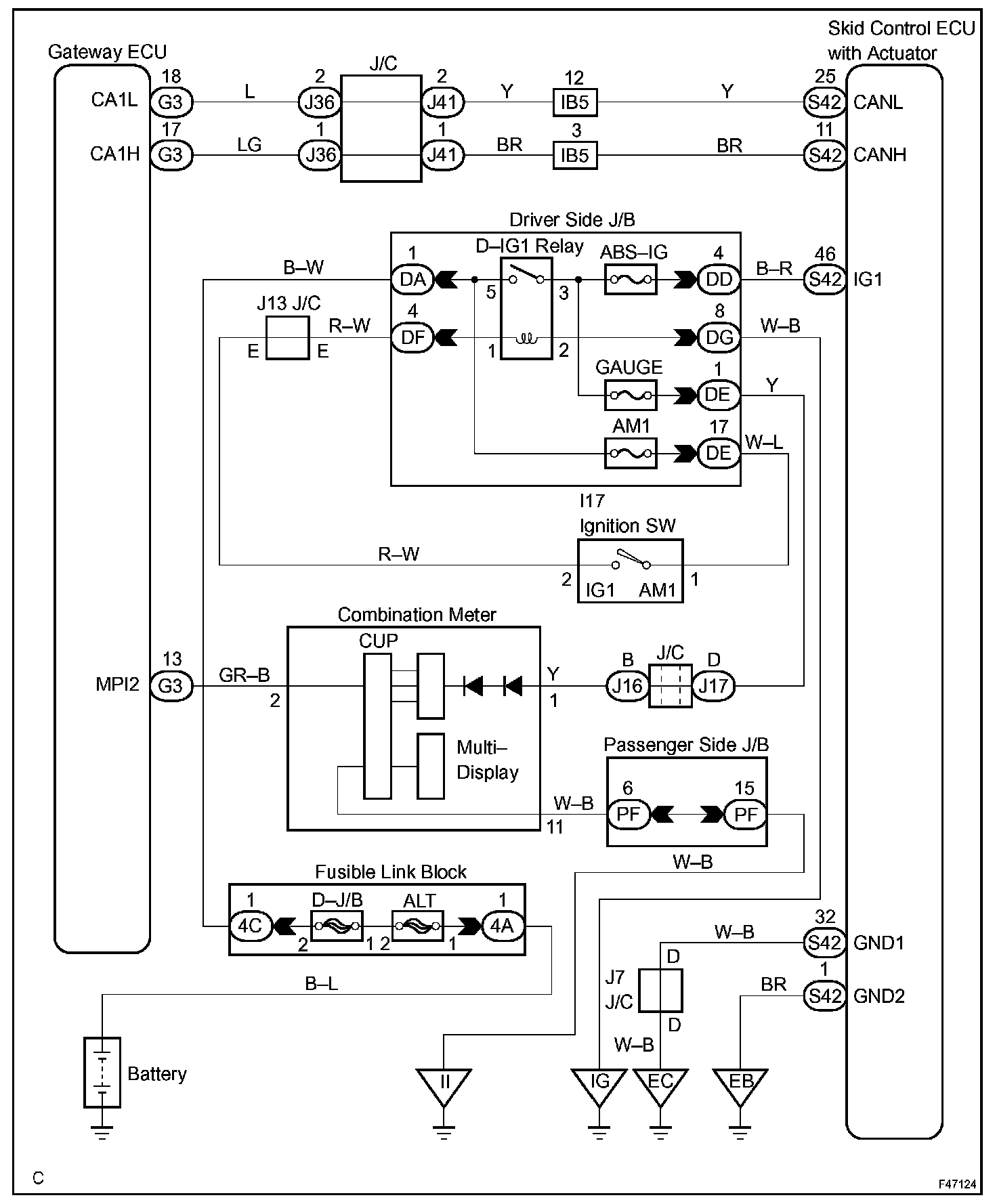 The skid control ECU is connected to the combination meter via CAN and MPX communications.