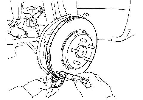 c. If the runout exceeds the maximum value, change the installation positions of the disc and axle so that the runout will become minimal. If the runout exceeds the maximum even when the installation positions are changed, check the bearing play in the axial direction and the axle hub runout. If the bearing play and the axle hub runout are normal and if the disc thickness is not within the specified range, shave the disc. If the disc thickness is less than the minimum, replace the disc.
