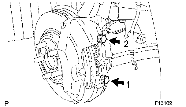 NOTICE: Since the bolted portion is an aluminum knuckle, keep it clean and avoid over tightening. Pull the disc brake cylinder assembly toward the outside of the vehicle to remove any play between the pin and knuckle hole. From this position tighten bolt 1 and then 2. Always follow these directions when installing.