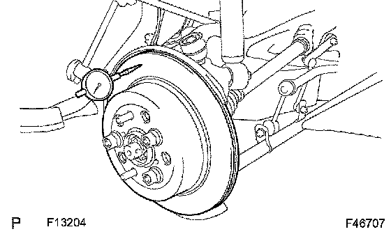 c. If the runout exceeds the maximum value, change the installation positions of the disc and axle so that the runout will become minimal. If the runout exceeds the maximum even when the installation positions are changed, check the bearing play in the axial direction and the axle hub runout. If the bearing play and the axle hub runout are normal and if the disc thickness is not within the specified range, shave the disc. If the disc thickness is less than the minimum, replace the disc.