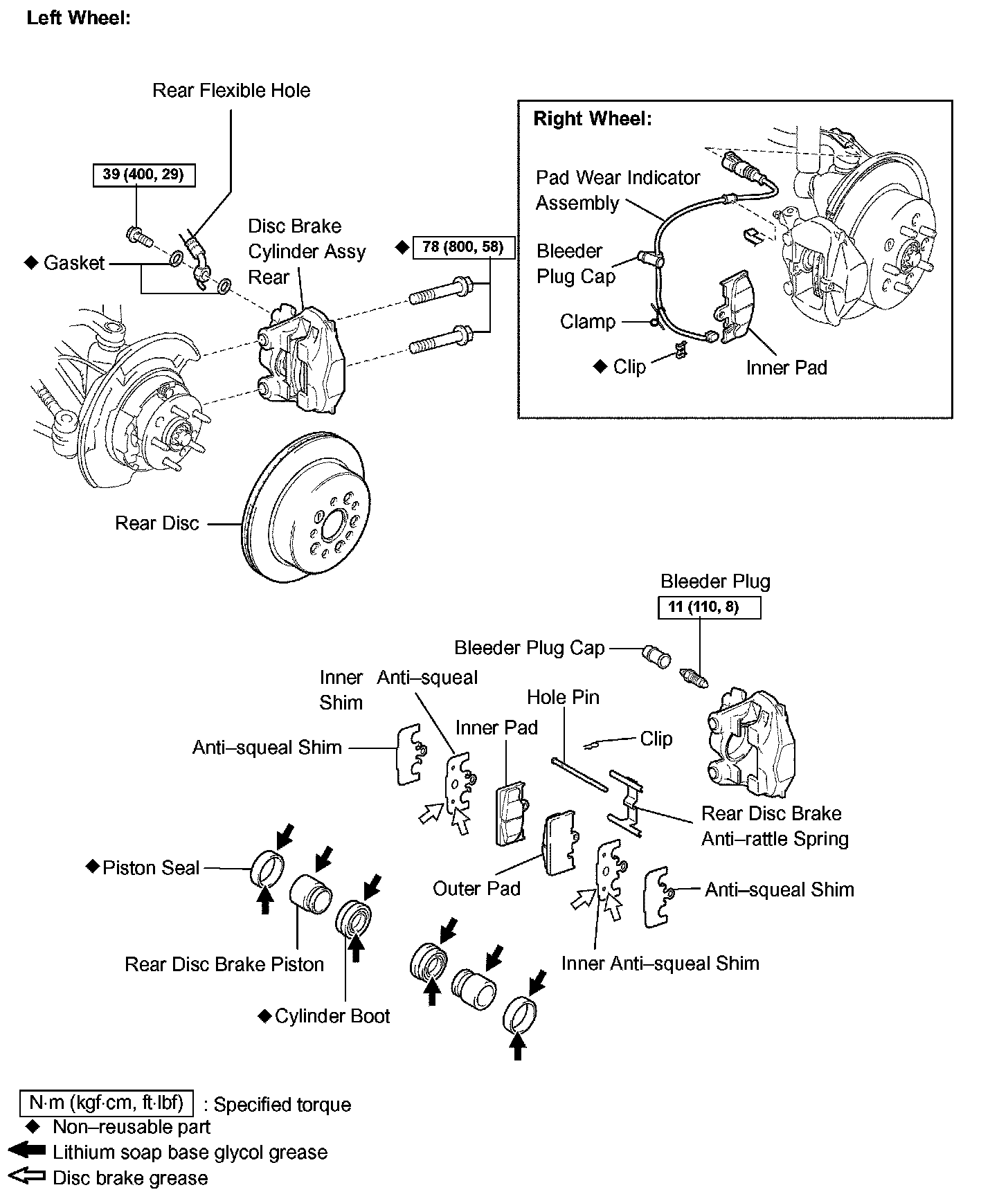 a. Apply lithium soap base glycol grease to the rear disc brake piston and a new cylinder boot.