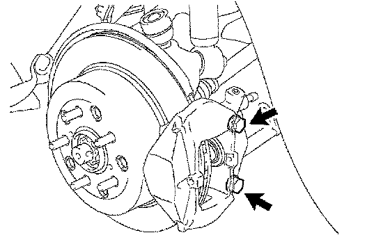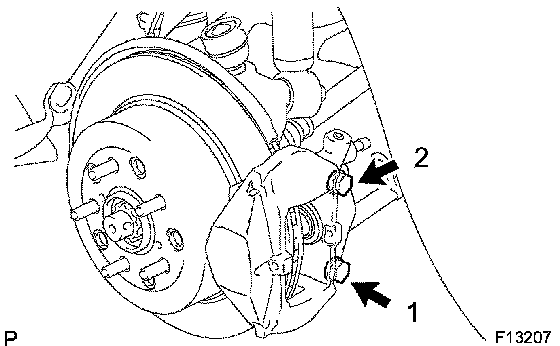 NOTICE: Since the bolted portion is an aluminum knuckle, keep it clean and avoid over tightening. Pull the disc brake cylinder assembly toward the outside of the vehicle to remove any play between the pin and knuckle hole. From this position tighten bolt 1 and then 2. Always follow these directions when installing.
